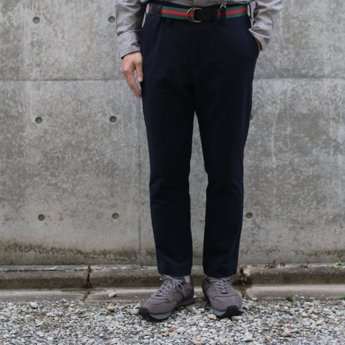 伸縮性の高いポリウレタン糸を綿糸でカバーリングした糸を高密度で編立てた素材を使用したトラウザーです。肌触りは綿特有の柔らかさがありますが、高密度で編み立てることでハリ感が出て季節を問わず着用できます。度目をしっかり詰めることで膝の抜けがほとんどなく型崩れも起きにくいのが特長です。またストレッチ天竺素材は着用時に窮屈感がなく、身体の動きに合わせて適度に伸縮しますので動きやすく、春から秋まで着用できます。汗をかいたり匂いが気になる季節でも家庭洗濯が可能ですので同素材のジャケット(JM8410)と組み合わせてビジネスシーン含めて多くのシーンで着用できます。