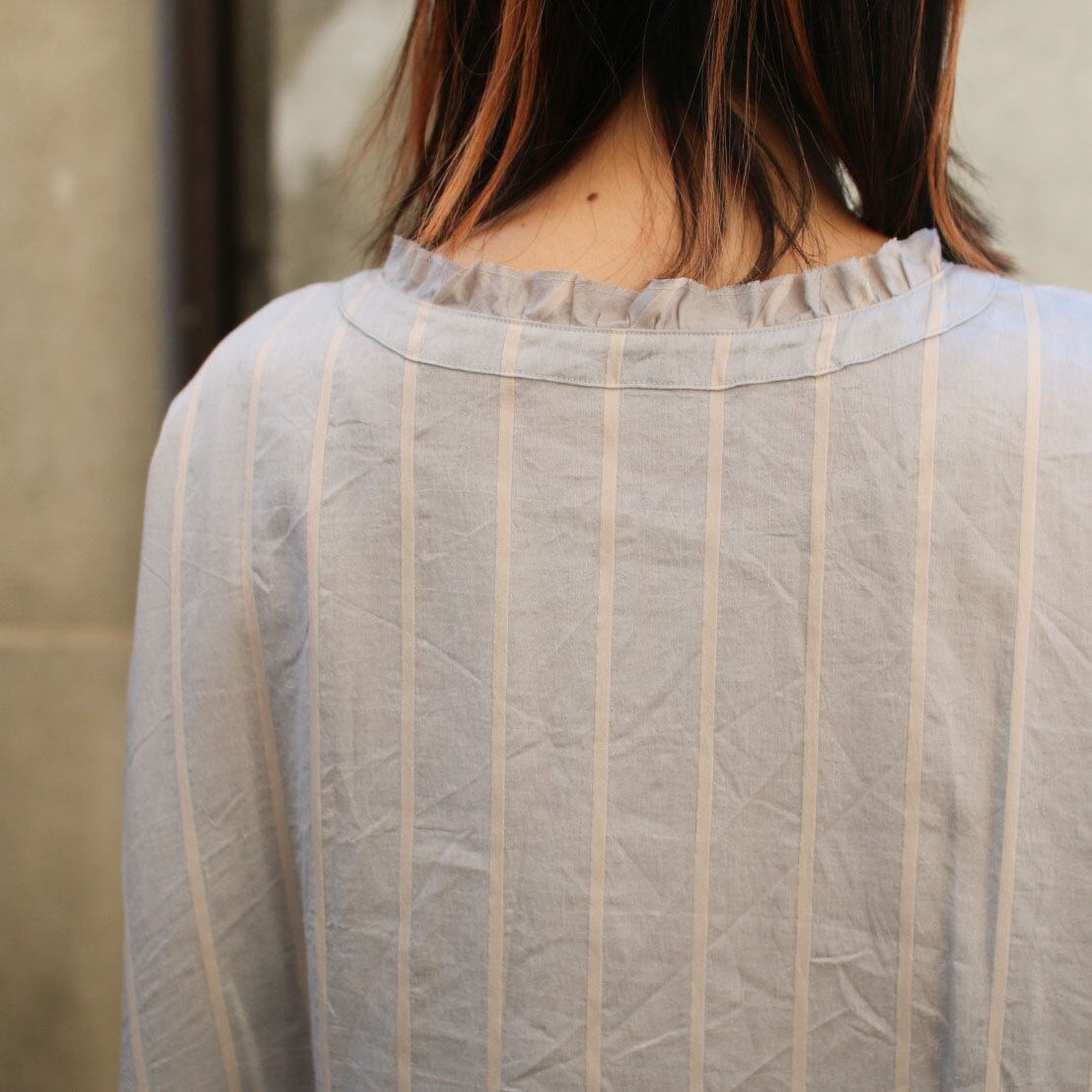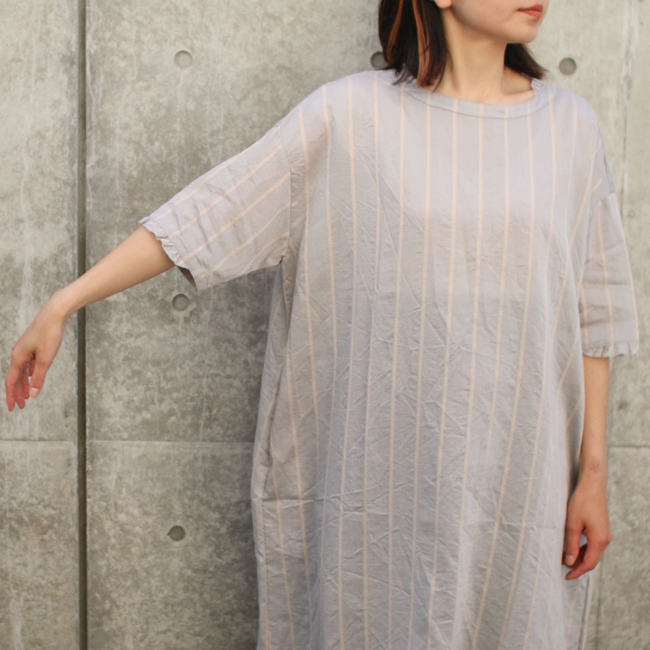 形はGauze#、ROBEらしい身体の線を拾わない、着心地の良いシルエットでお袖も五分袖と少し長めです。ネック部分とお袖のフリルもかわいい大人のストライプワンピース。