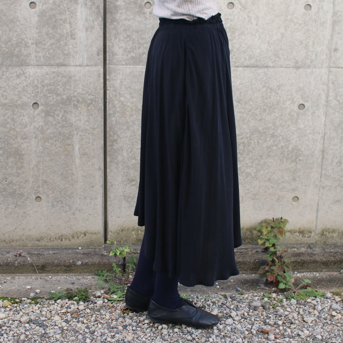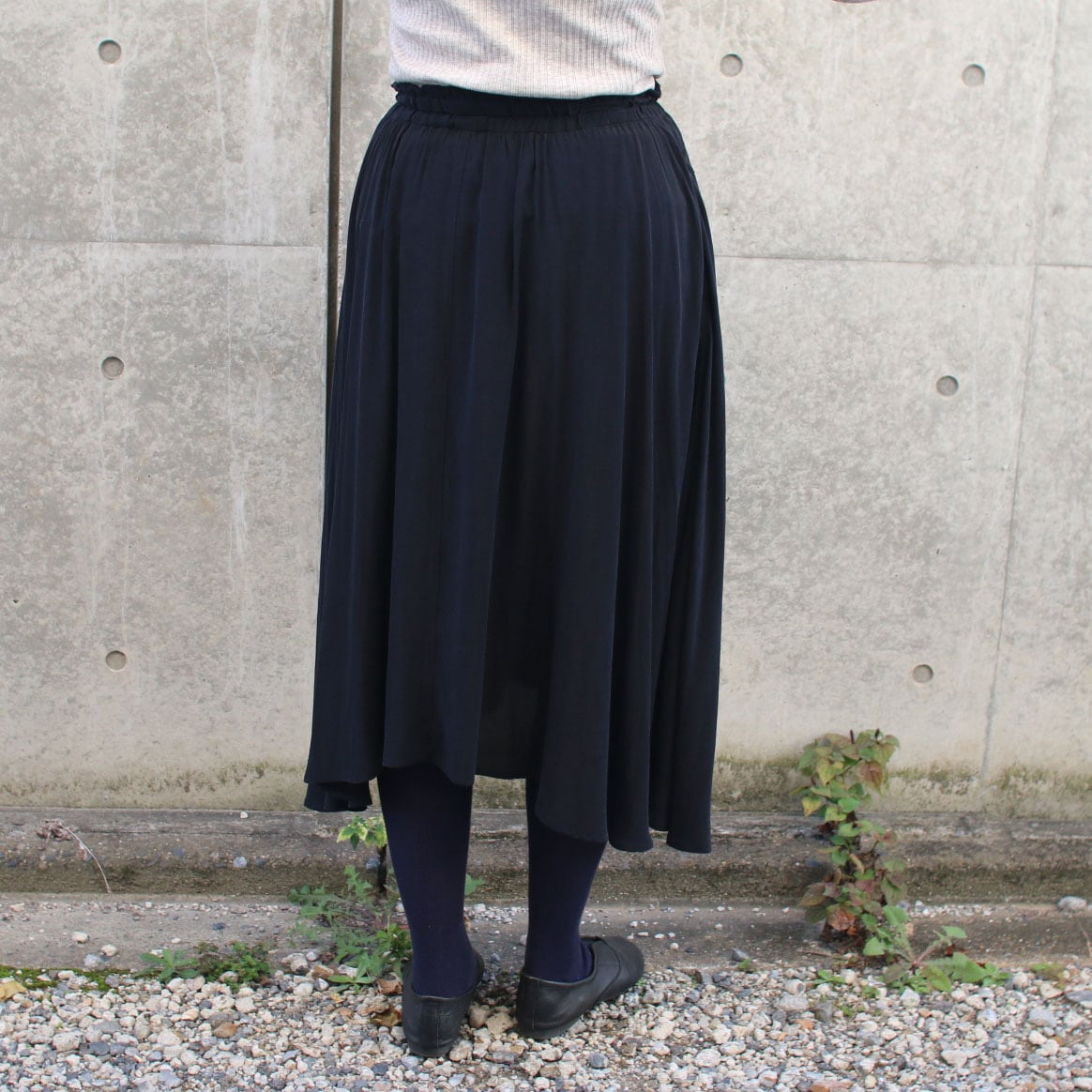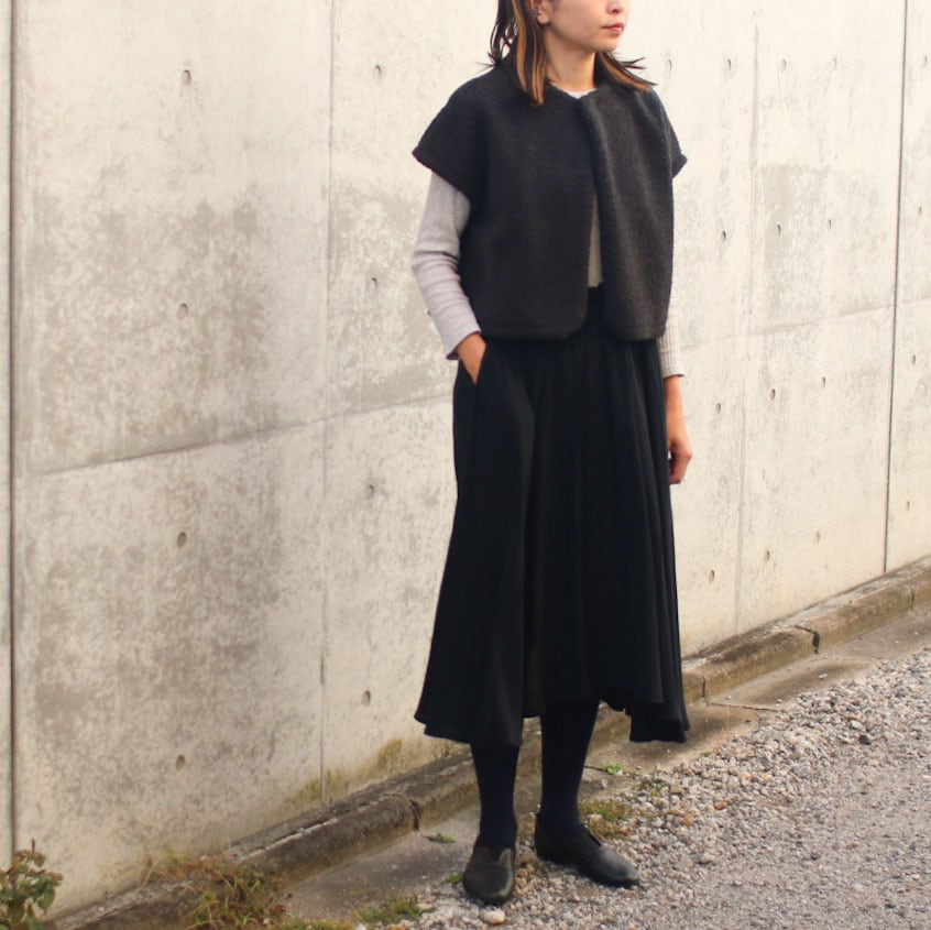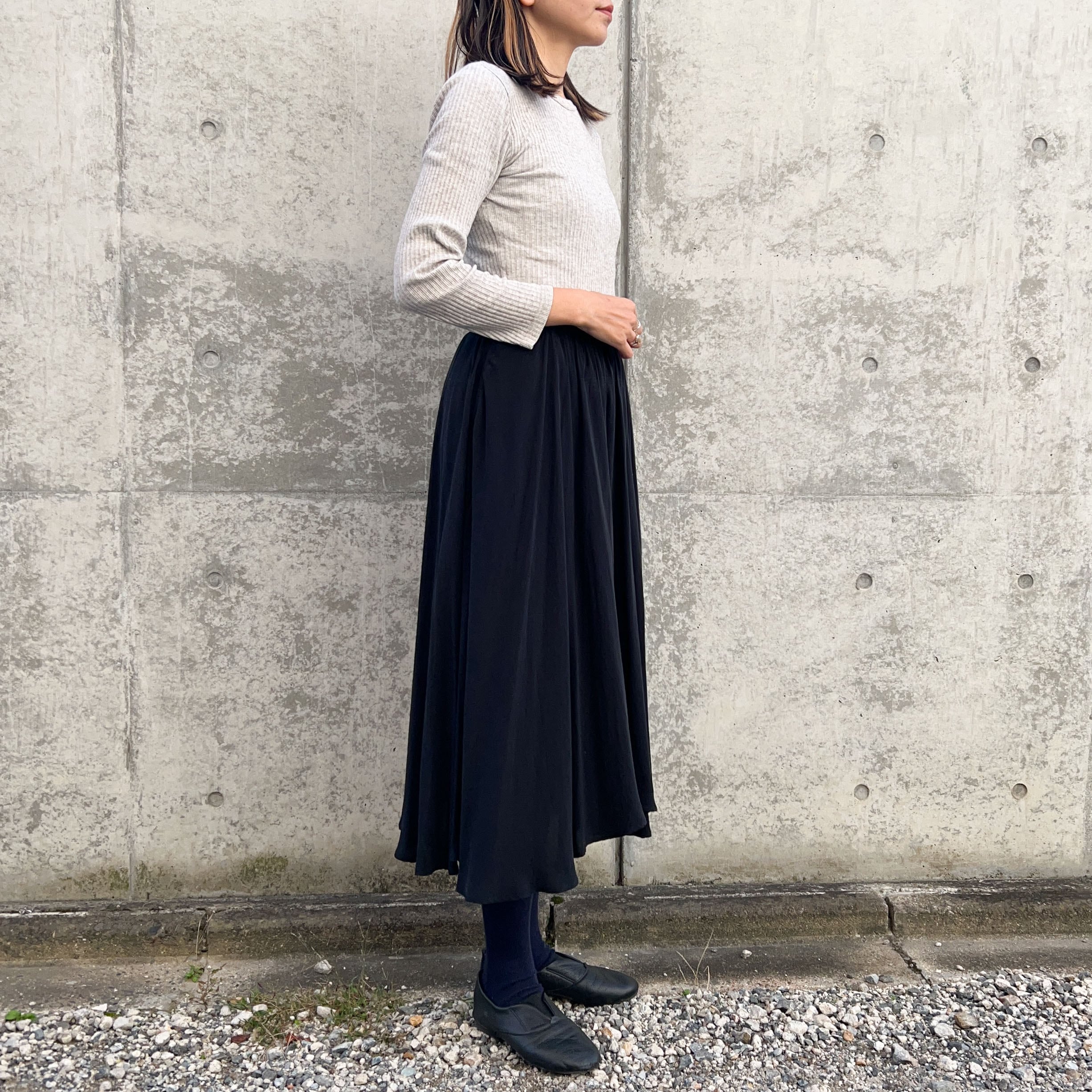 歩くとスカートが様々に動き揺れる、表情を感じるスカートです。膝の隠れる長めの丈ですのでタイツやブーツとのコーディネートもおすすめです。