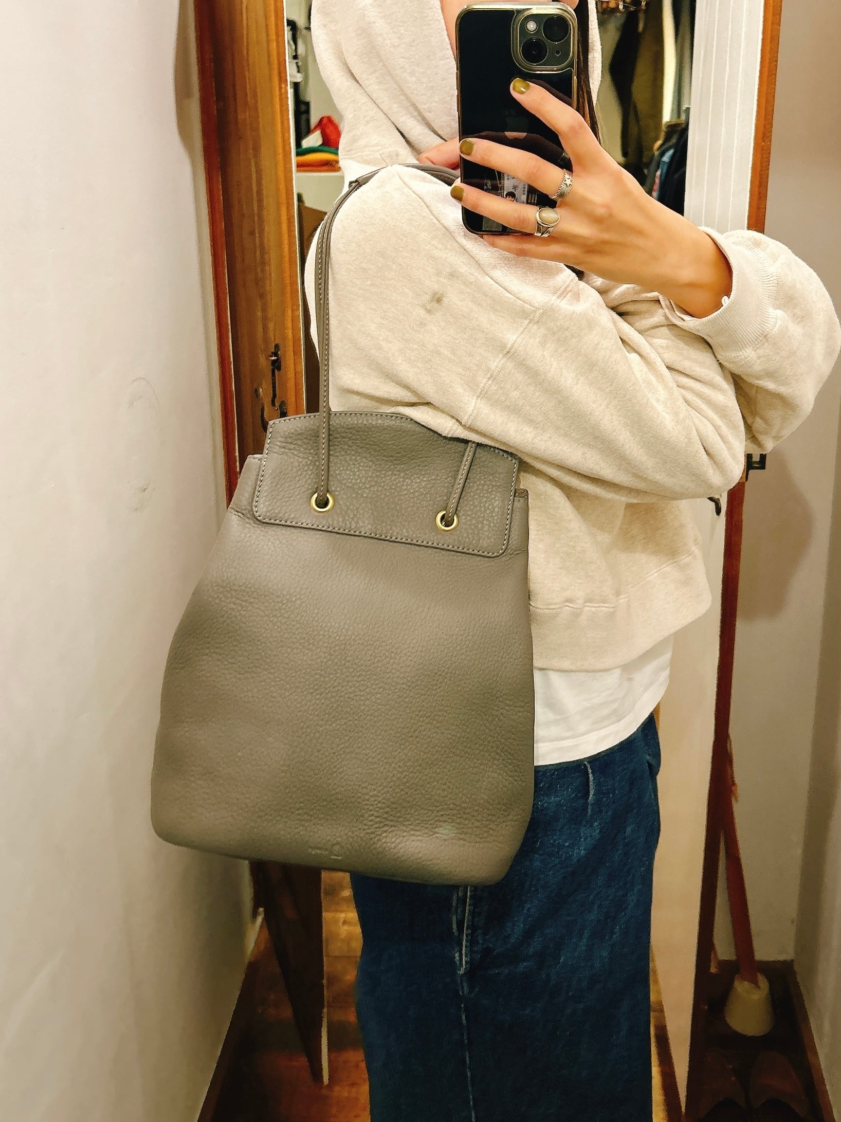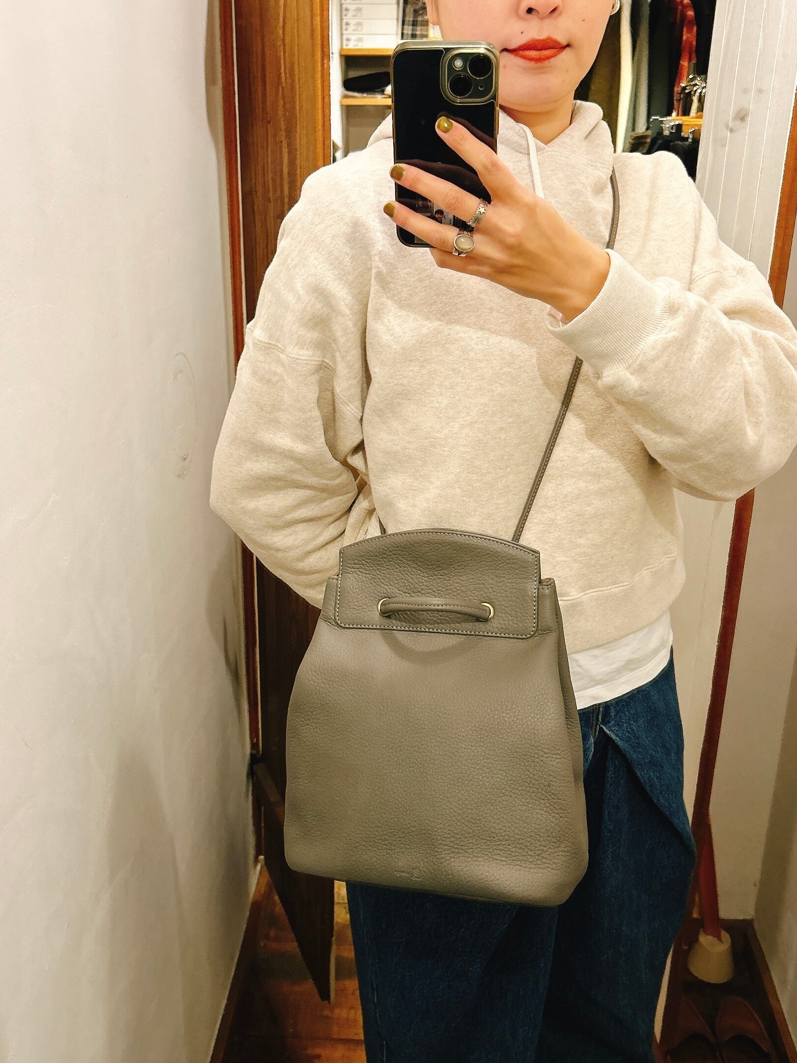 街中でもいろんな素材で良く見かけるドローストリングバッグ。mononoguでは、柔らかい牛革を使用。カジュアルになりがちなバッグを牛革にすることで使える場面がグッと広がり、普段使いからオケージョンまで。