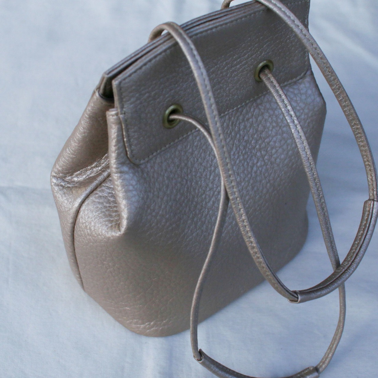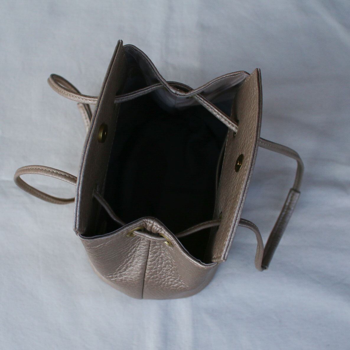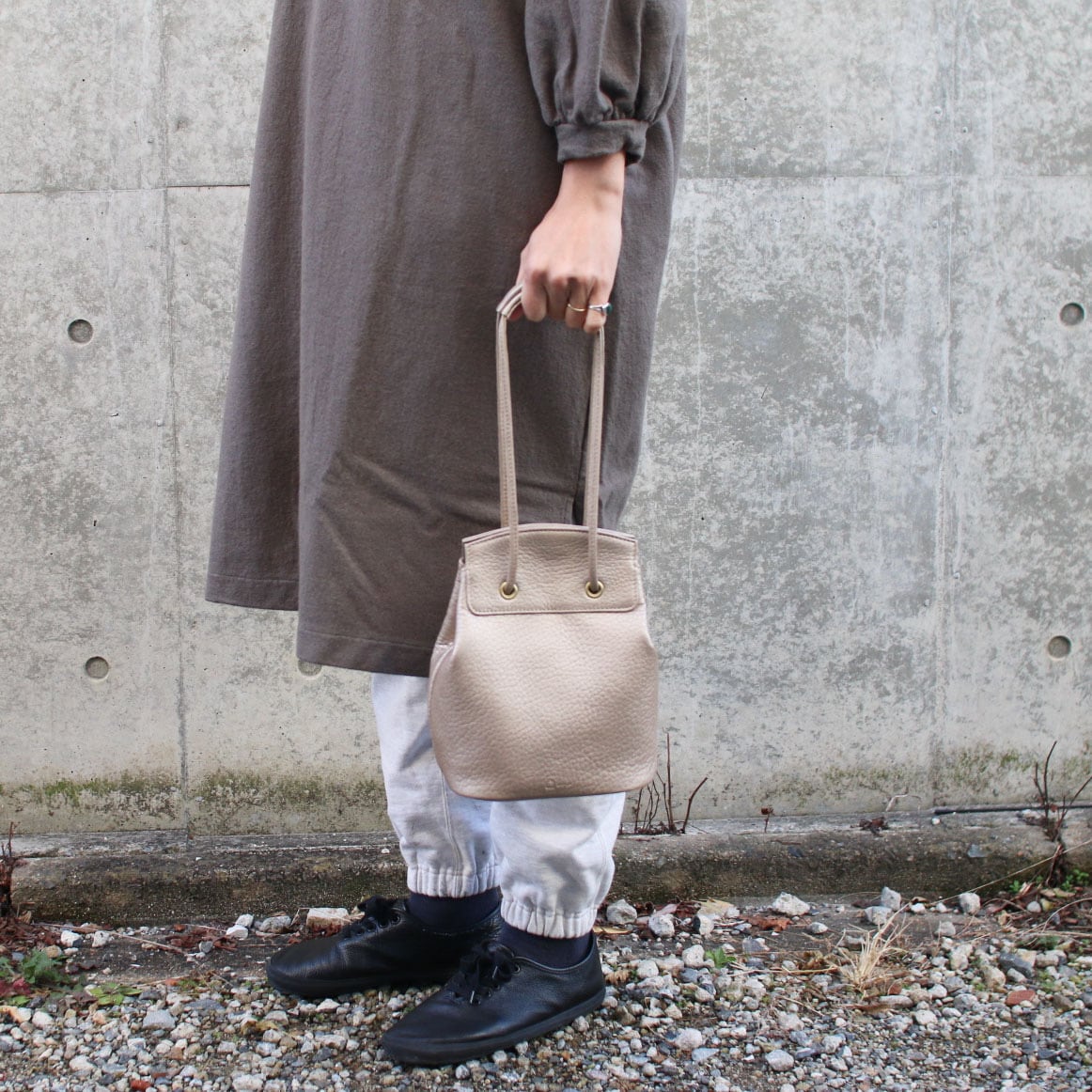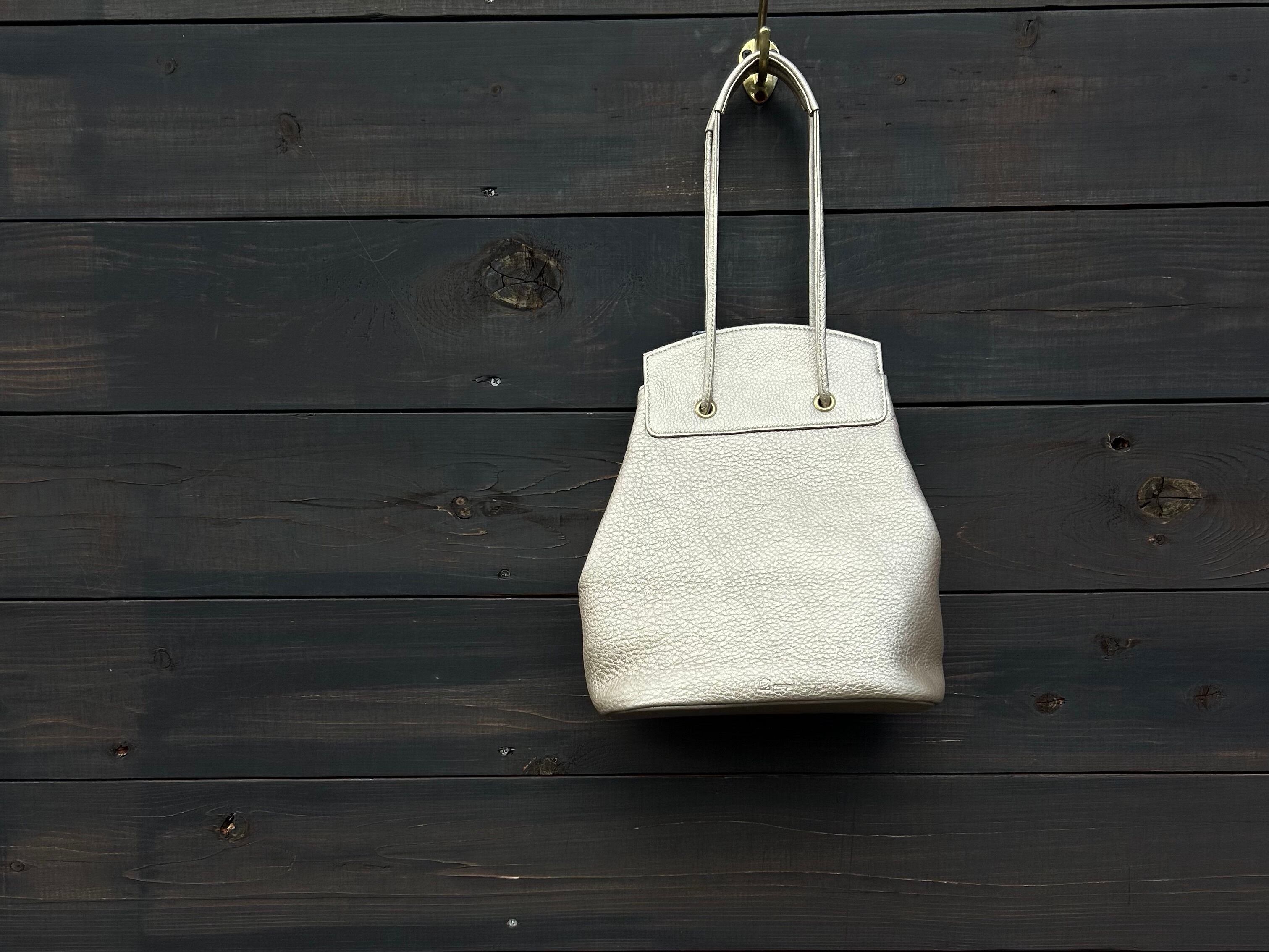 街中でもいろんな素材で良く見かけるドローストリングバッグ。mononoguでは、柔らかい牛革を使用。カジュアルになりがちなバッグを牛革にすることで使える場面がグッと広がり、普段使いからオケージョンまで。