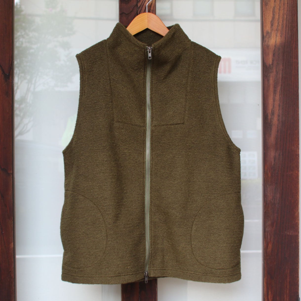 イタリア製のスライバーニットを使用したベストです。スライバーニットとは糸になる前の撚りのない繊維の束の状態でニットにしたもののことで、その表情が特徴的。アウトドアのディテールが詰め込まれた1着。