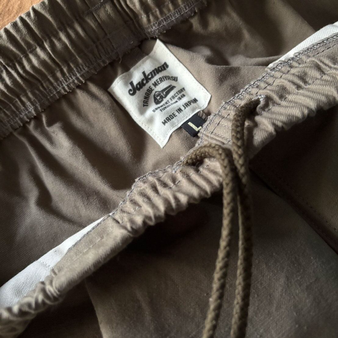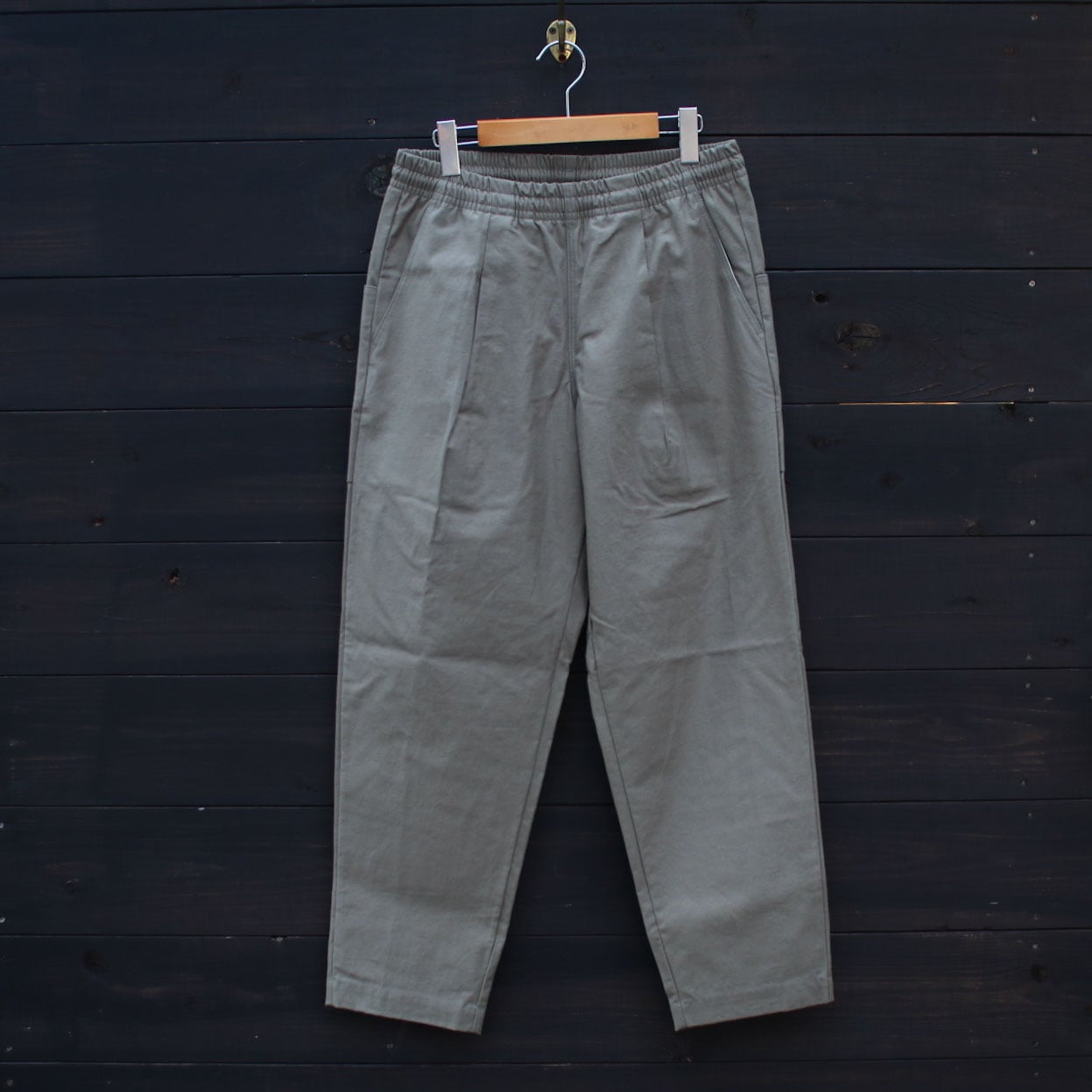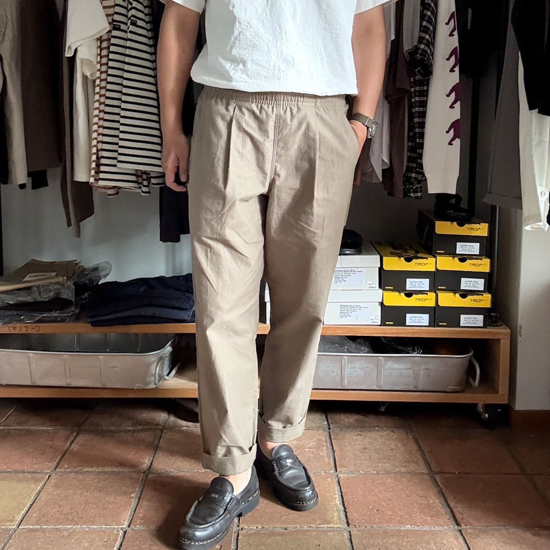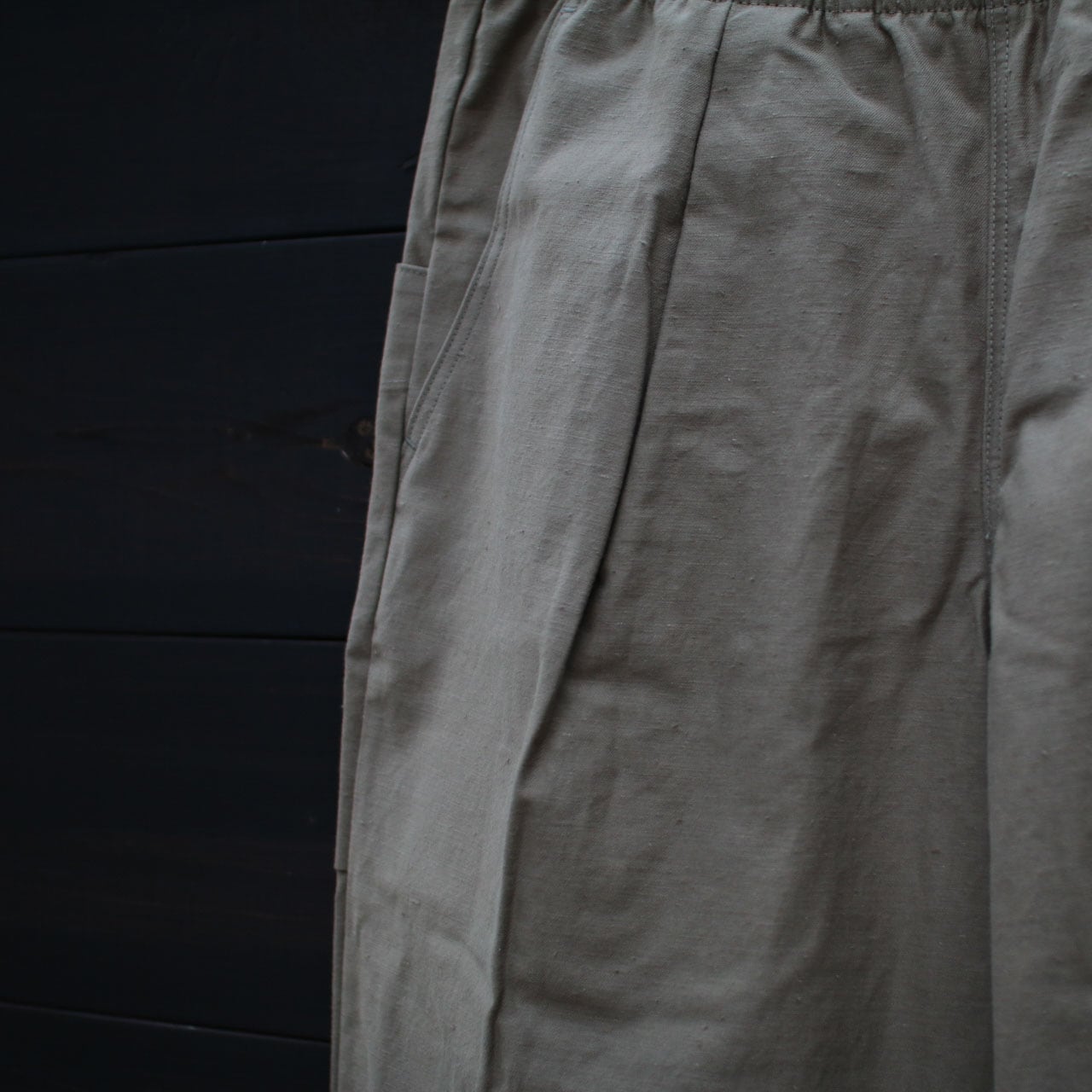 乾燥感のあるアメリカ、オーストラリアの混合綿を使用、その原綿をカーディングする際、機械の調整でネップを作り、レピア織機で糸に強度を加えながら織ることで生地自体の強度を高めたバックネップ素材を使用したBNアンプスパンツです。このバックネップ素材は表面に上品さを出すためシルケット加工をせず染色、ネップの凹凸を残しながら自然で上品な表情に仕上げました。またハリコシを出すために樹脂で硬仕上げを施し防風性の向上と洗濯による形状変化を抑える加工を加えました。デザインはBaseballの球審の腰回りのシルエットを参考にスペアボールを入れていたような大きめのマチ付きポケットを配しました。腰回りはゆったりとしながらも裾にかけて強めのテーパーですっきり見える設計です。ウエストはゴムとコードで調節が可能です。