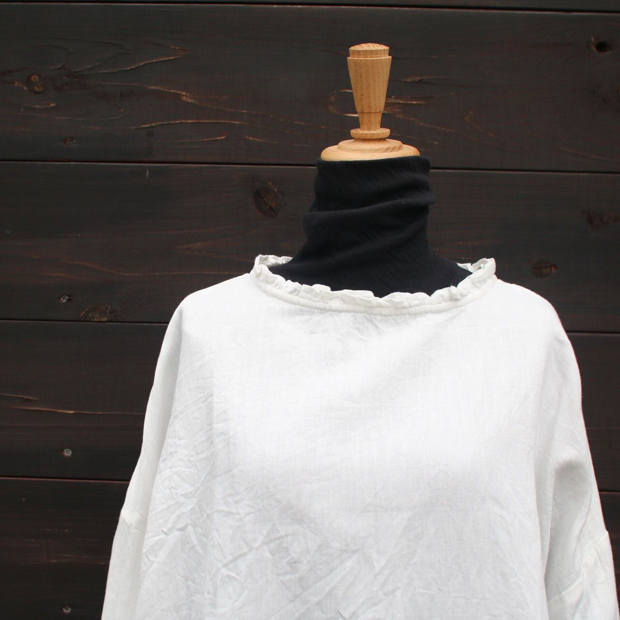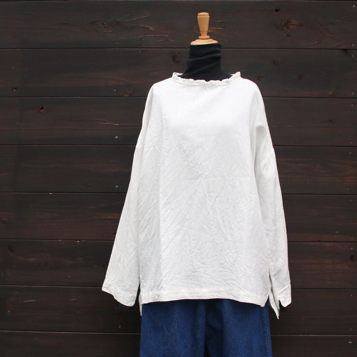 ハリがあるので、ラフすぎない見た目に襟元の小さなダブルフリルがかわいい1着。クタクタに着込んでいただきたいです。