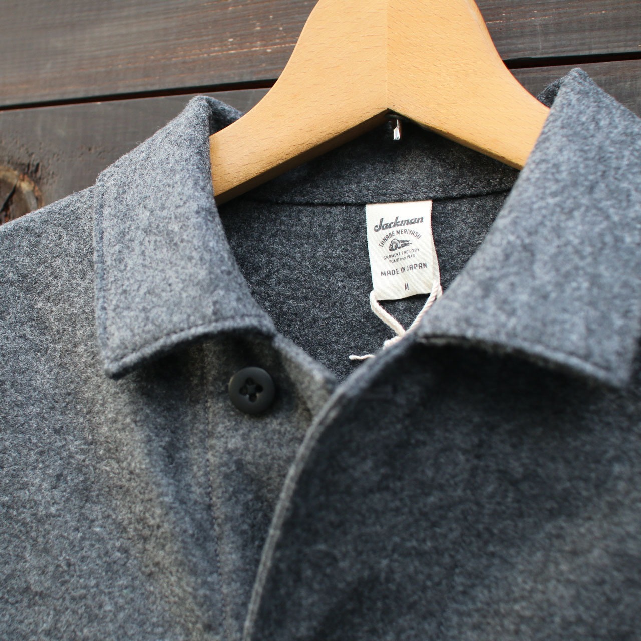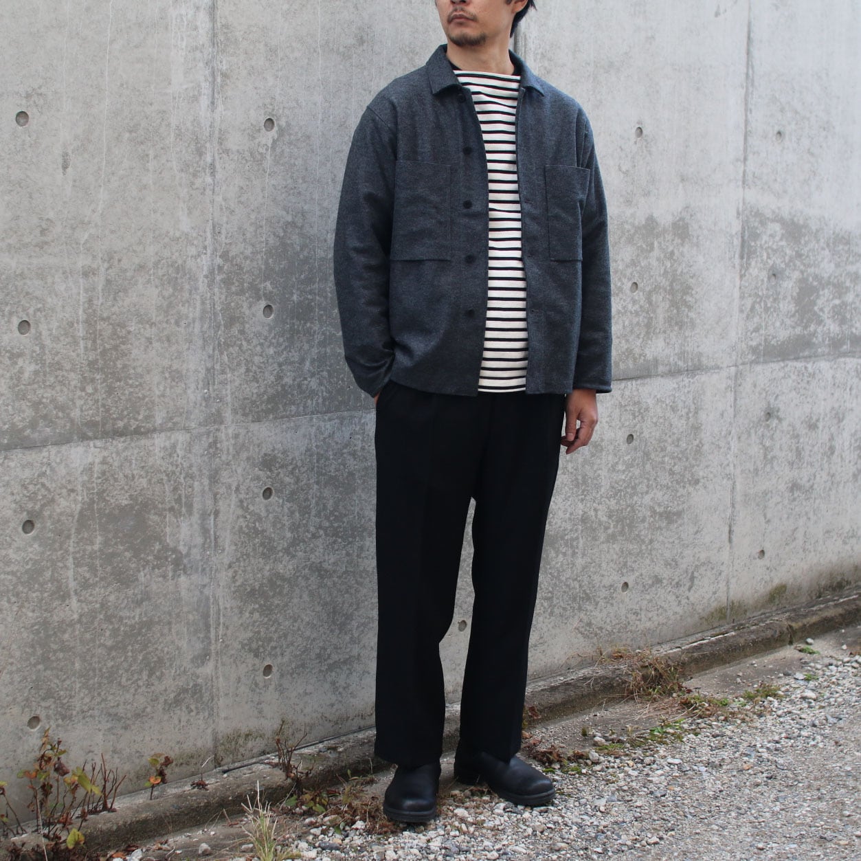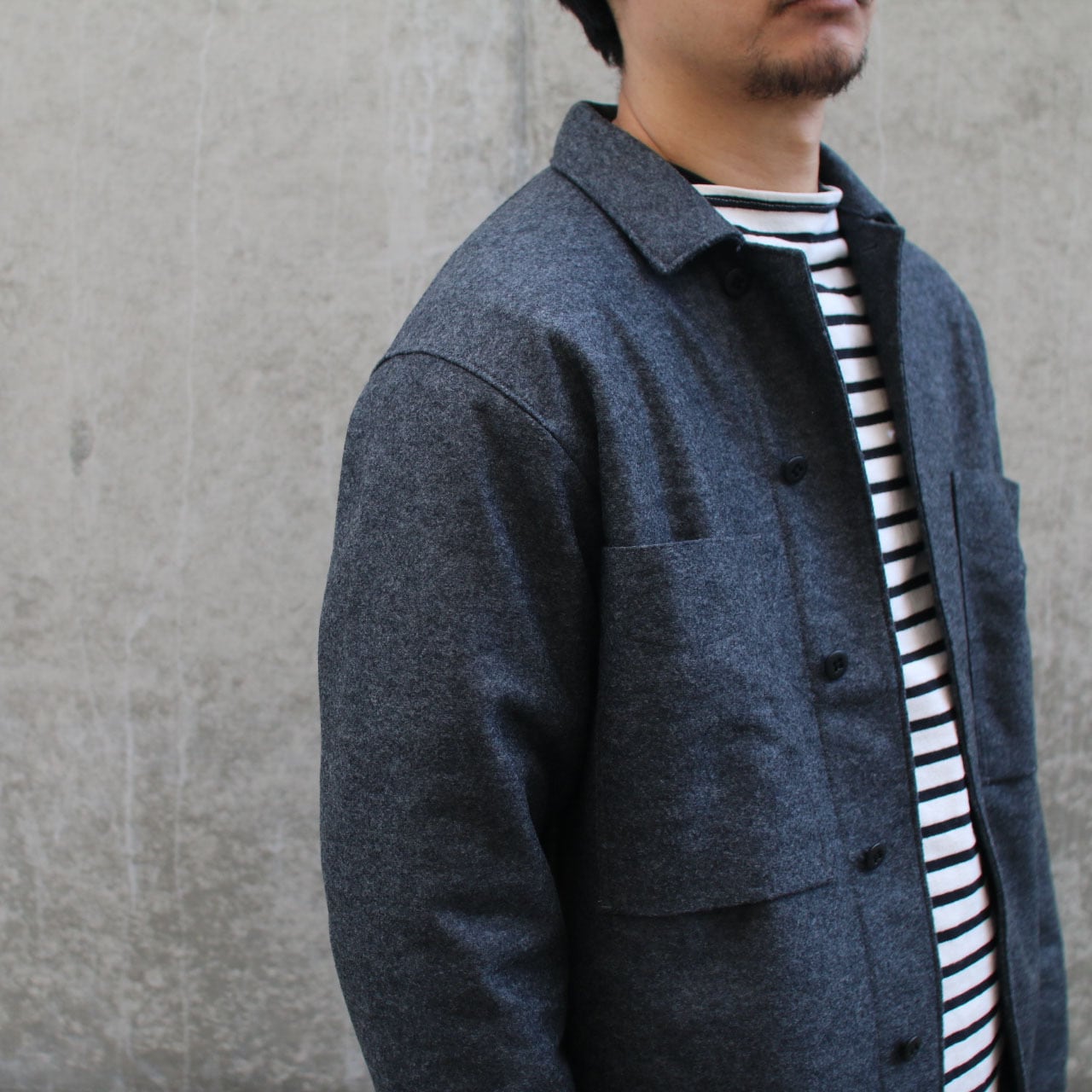 ウールリングヤーンを使用した編地に強力な熱と圧力をかけて加工した素材を使用したBaseballシャツです。リングヤーンは細く強い芯糸に絡み糸を撚り合わせて完成させたリング状の糸で不安定な羊毛を安定させ柔らかな風合いを保つ糸です。この糸で編み立てた素材はウールメルトンのようなハードな風合いと程よい柔らかさ、丸みを帯びた表情を作ります。デザインはBaseballユニフォームに襟がついていた時代のデザインをベースにアウターとしての機能を考え大振りのポケットを配しました。