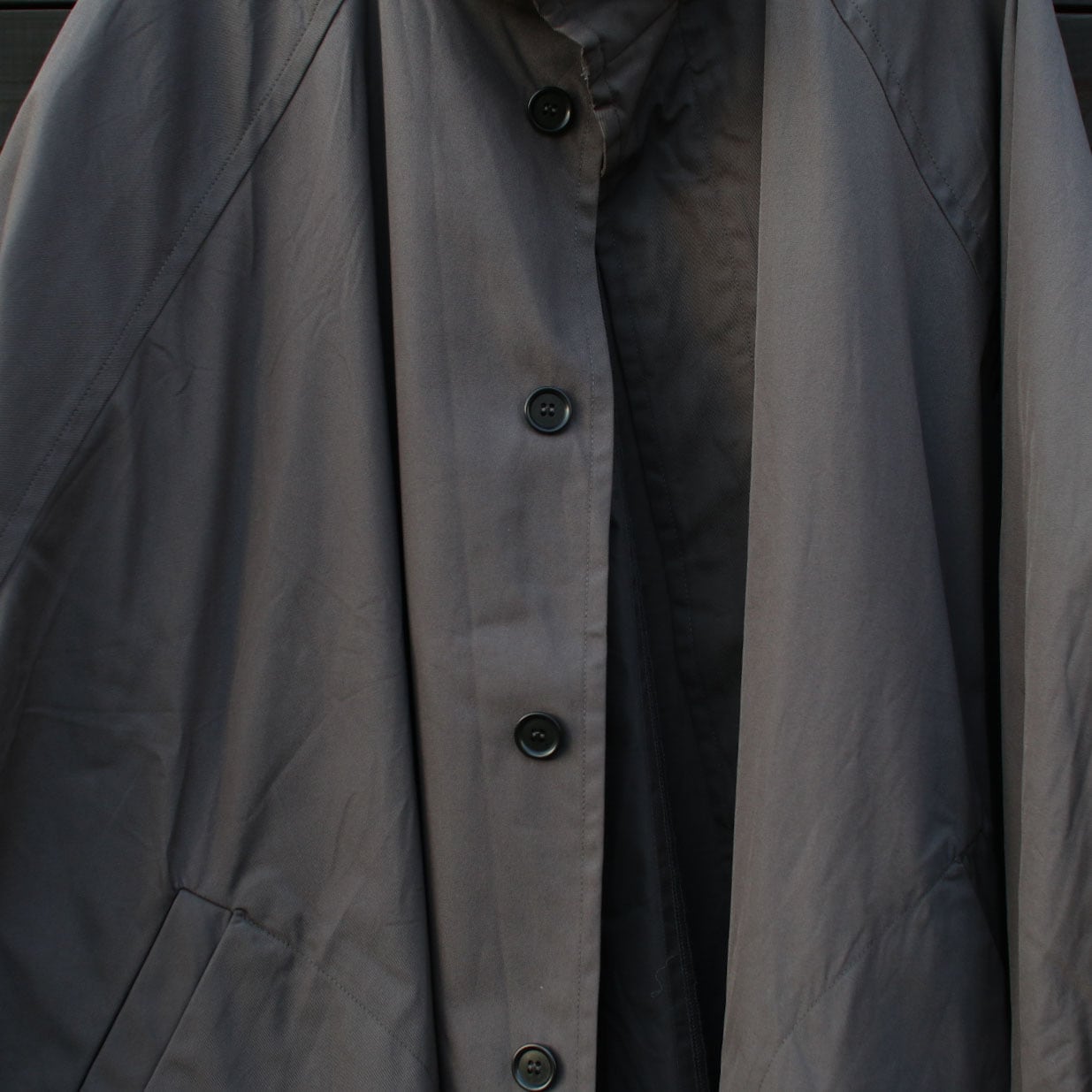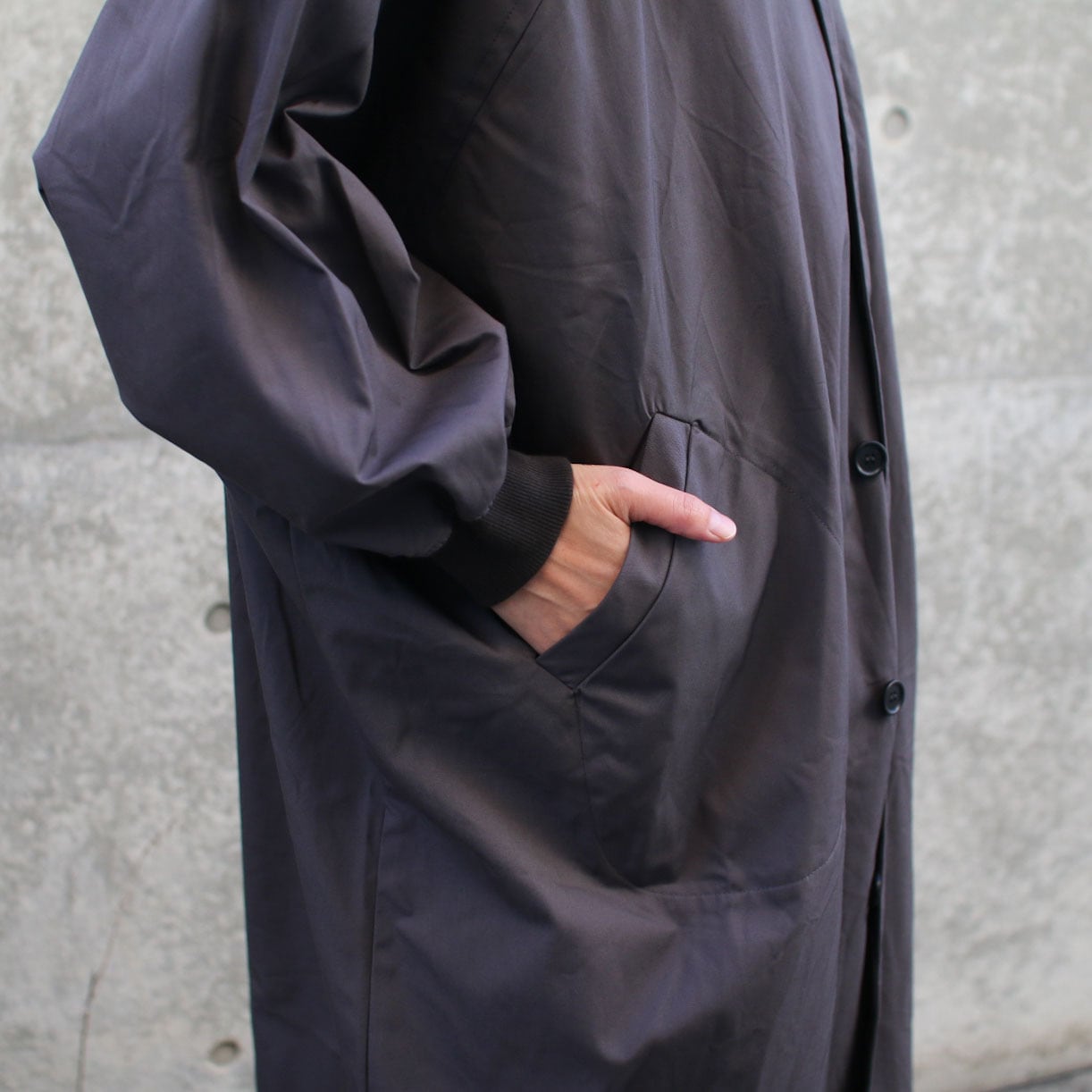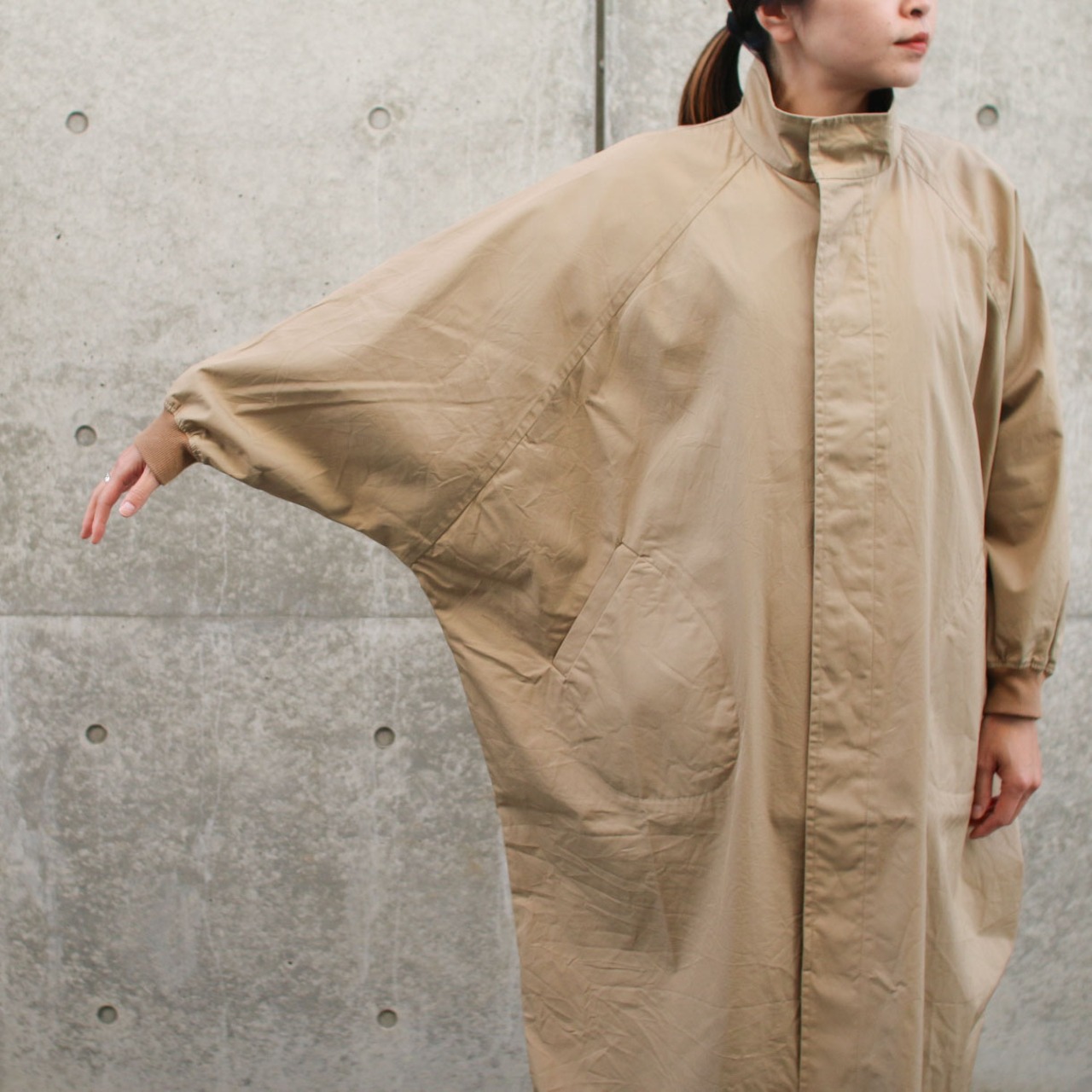 LABORATORYより届きました。身幅たっぷり、ラグランのドルマンスリーブもたっぷりめにまさにムササビ!着丈も長め、綿ギャバのコートをご提案です。
