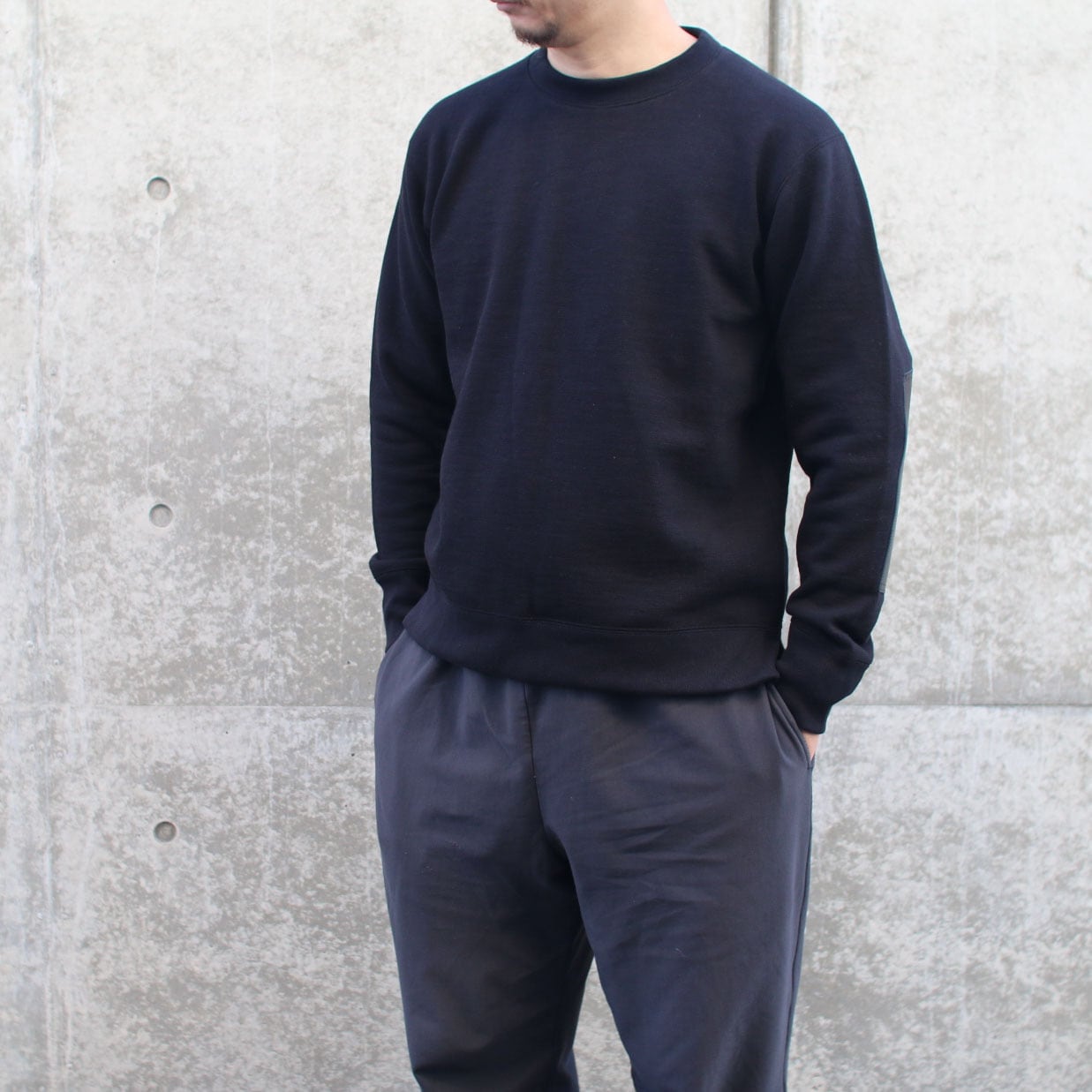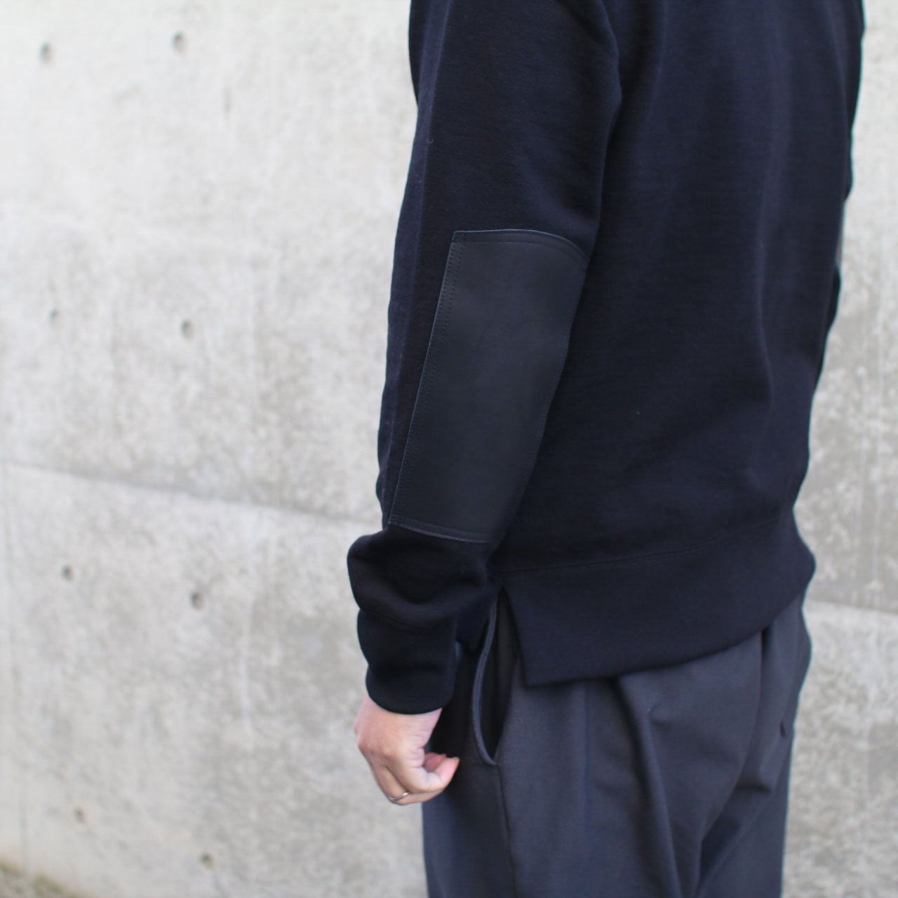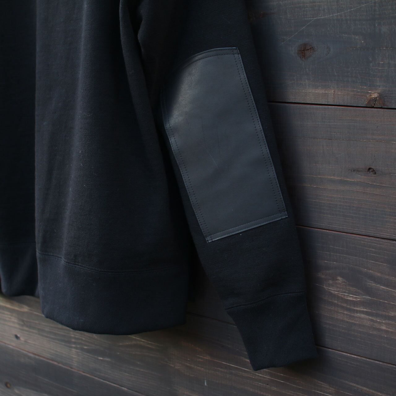 太番手の国産糸を使用し日本国内で編み立てた肉厚なGG(ガラガラ)裏毛素材のアーマードクルーネックです。Baseball創世記に補強手段として使用されていたレザーパーツの部分使用を参考に、肘部分にウォッシャブルレザーパーツを配置して補強。1枚で着用するイメージを想定してセットインラグランの袖付け、裾には段差のあるスリットを入れました。レザーパーツそれぞれ個体差があり表情が異なることで世界で1枚の表情をお楽しみいただけます。家庭洗濯可能なウォッシャブルレザーですが洗濯時に色移りの可能性があることと乾燥機の使用は厳禁ですのでご注意ください。