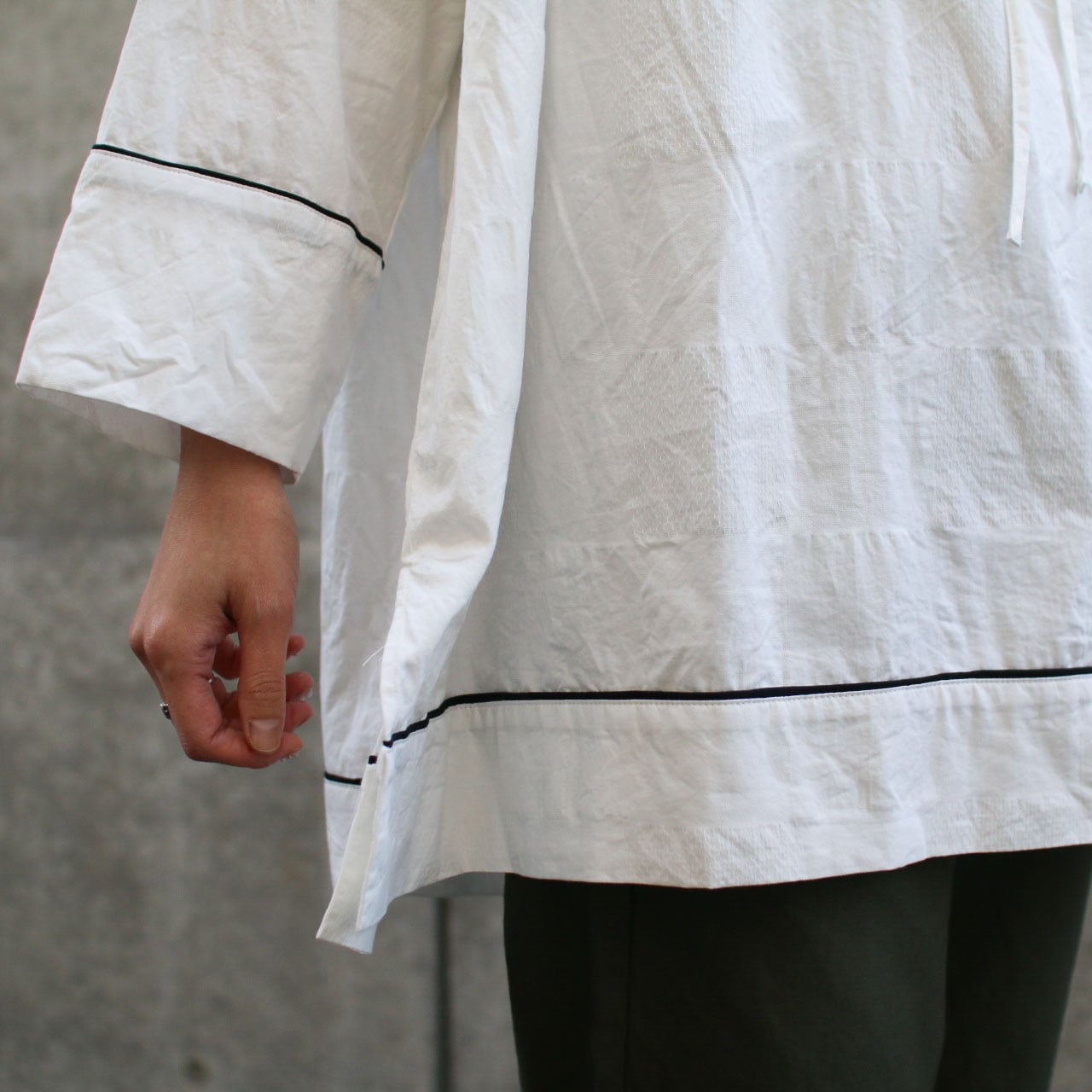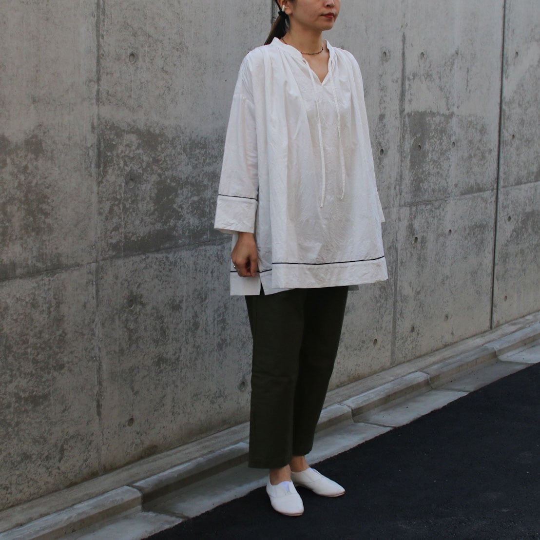 チュニック丈ですので、ロング丈のパンツはもちろんロングスカートやショートパンツでリゾートスタイルとかも素敵です。