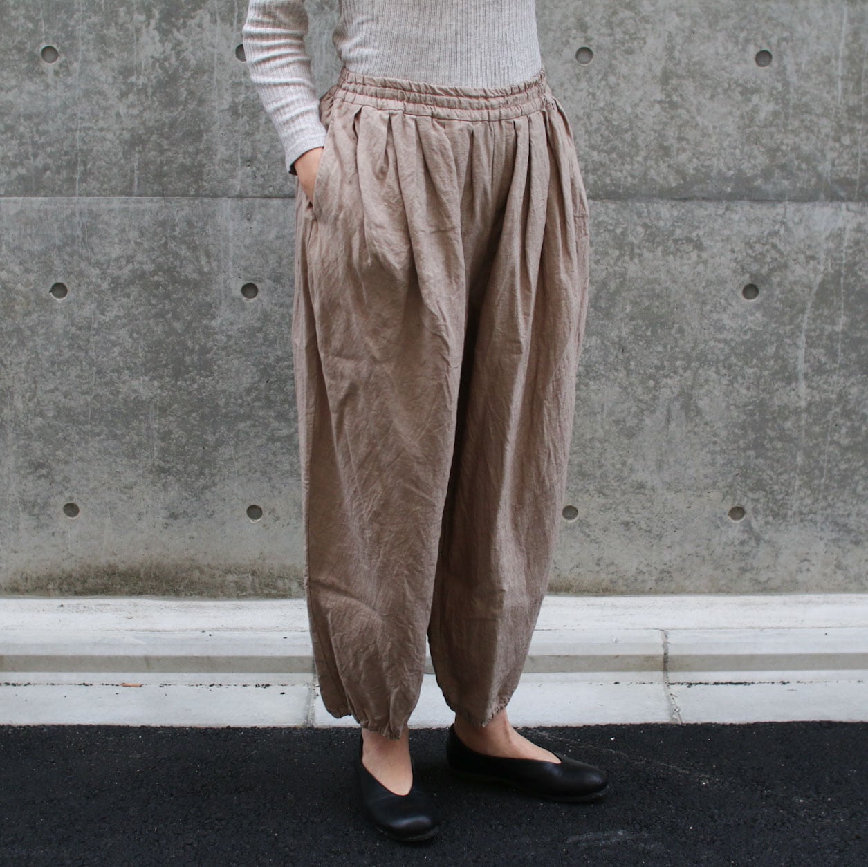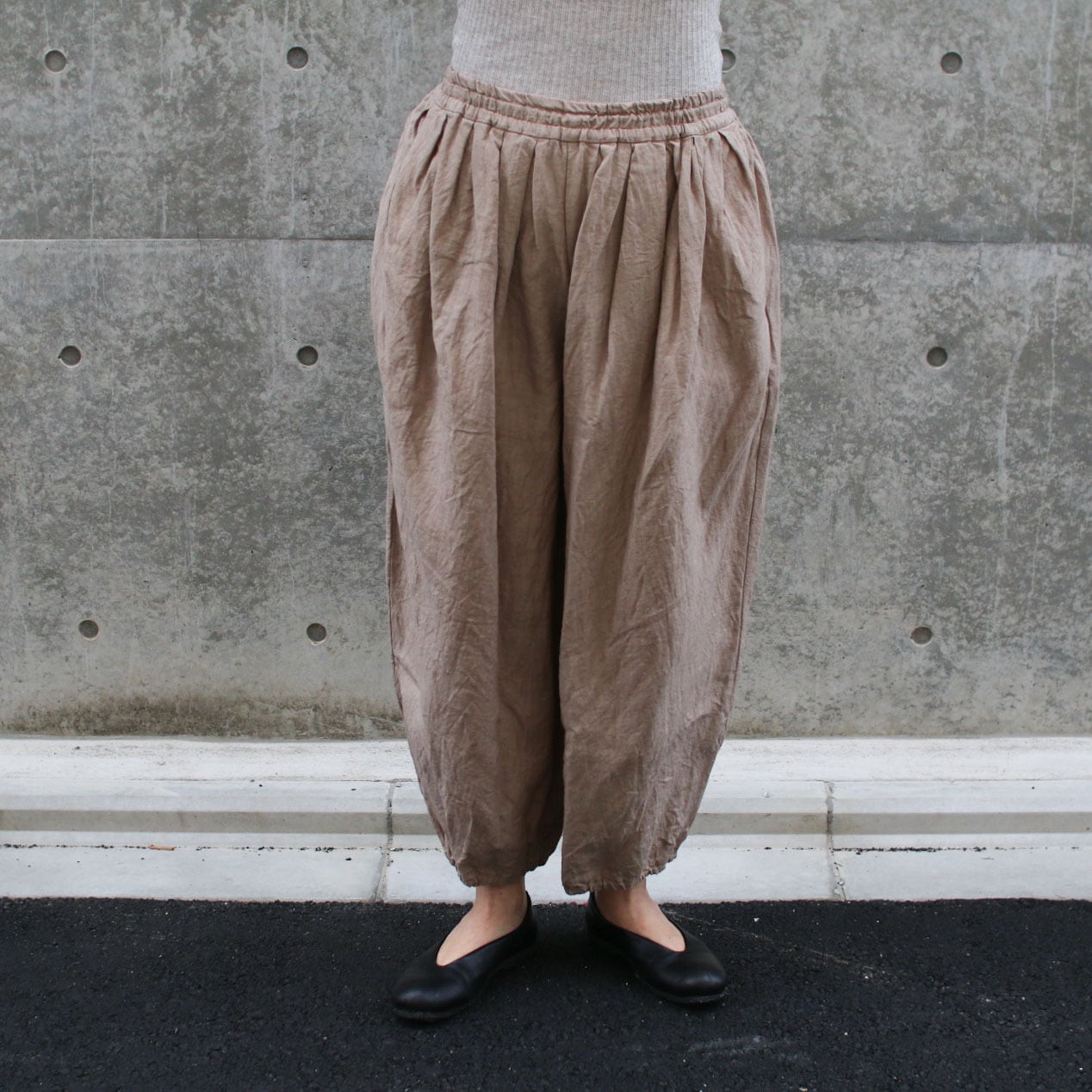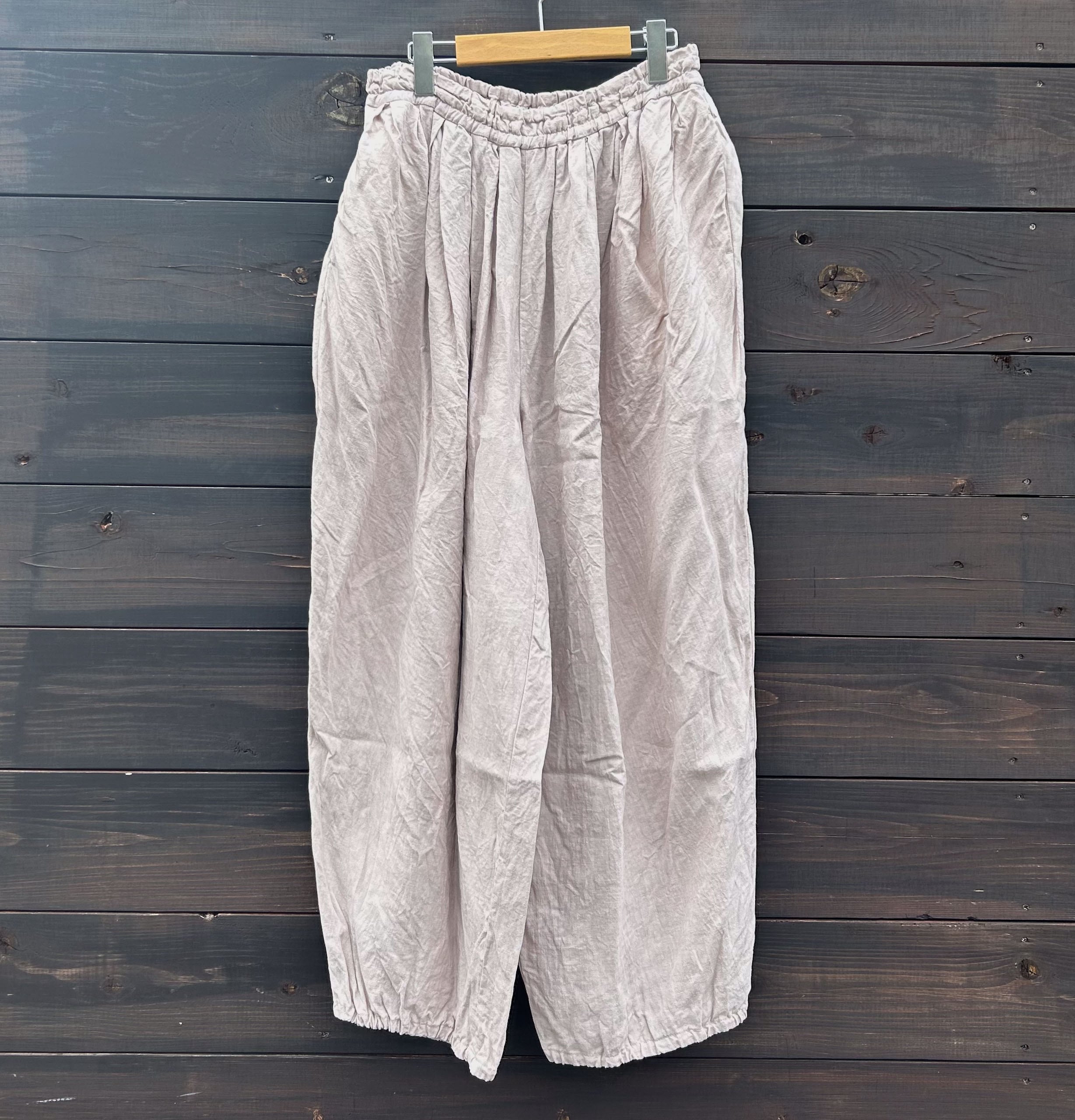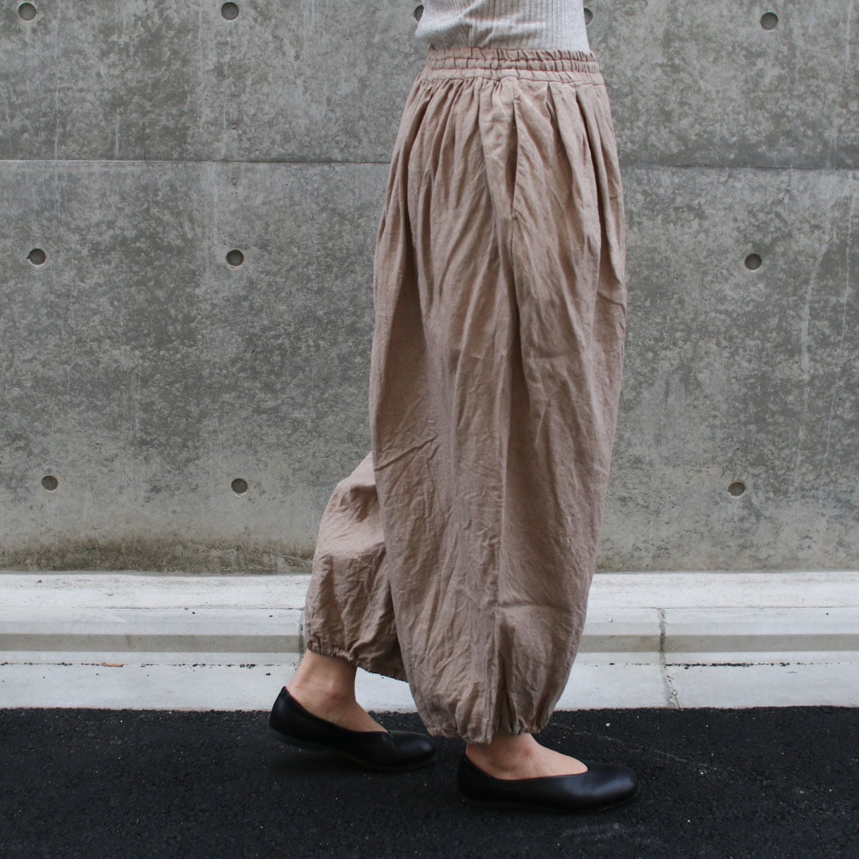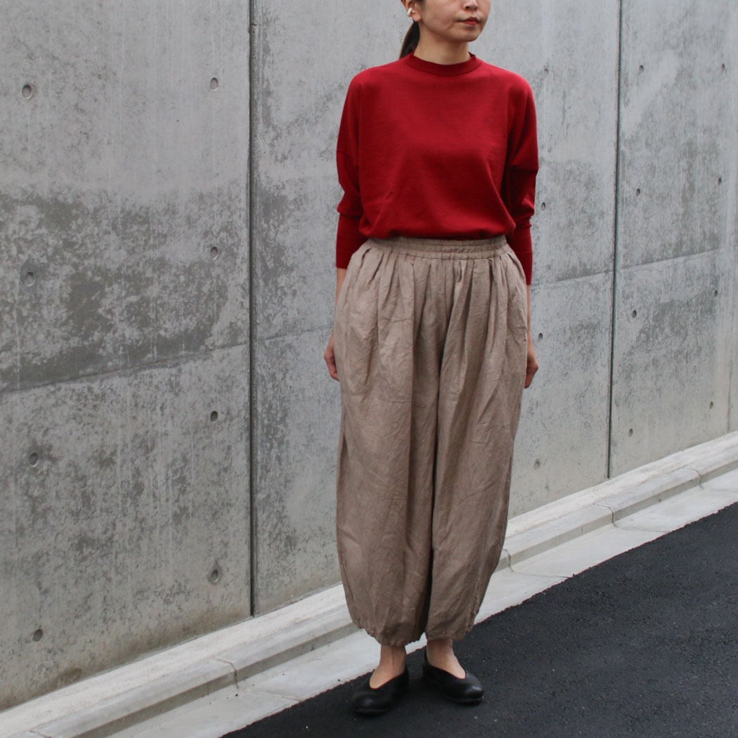 ほどよいボリュームと裾がゴムでテーパードのライン、風合いの良いリネン素材は今から初秋まで着用できます。たっぷりタックが入り、バルーンのようなシルエットですが柔らかいリネンでオチ感があり、膨らみがそこまで強くなく一枚でも重ね着にも使いやすい。