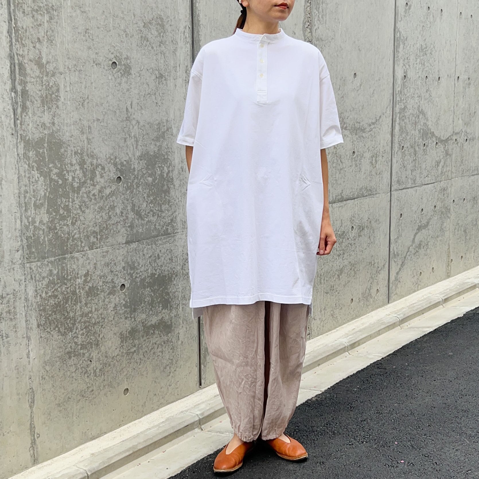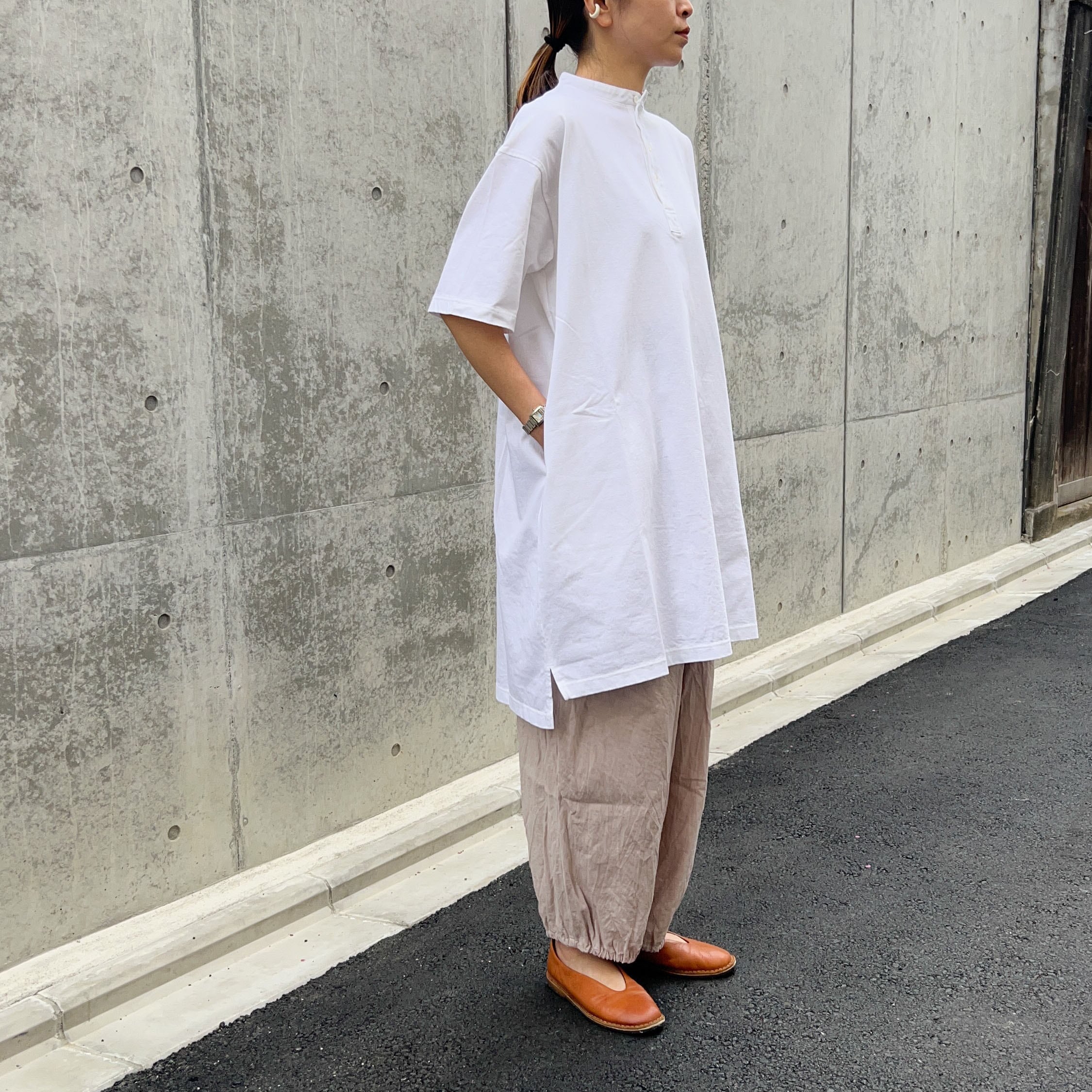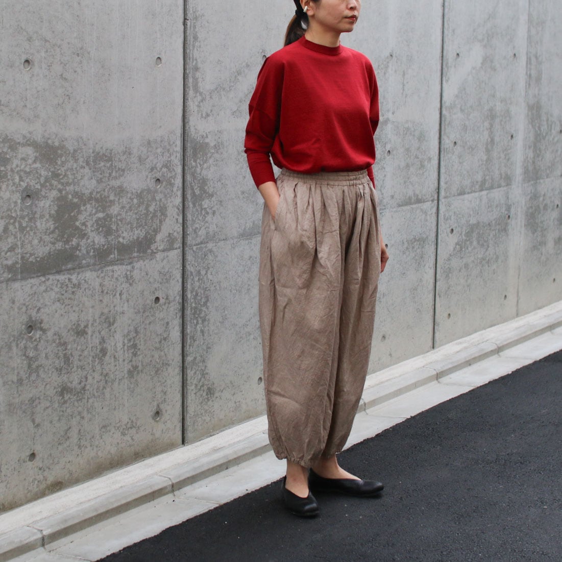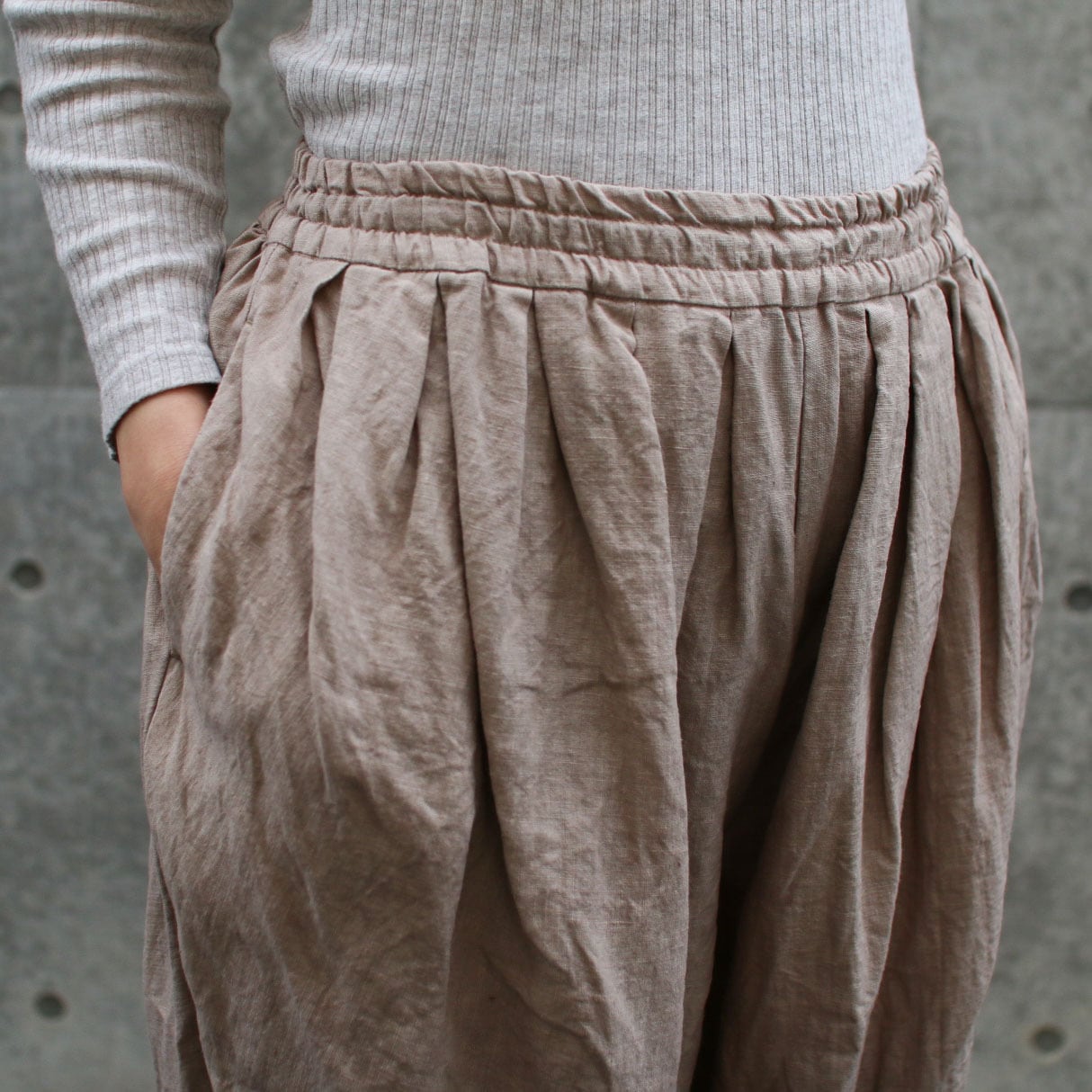 ほどよいボリュームと裾がゴムでテーパードのライン、風合いの良いリネン素材は今から初秋まで着用できます。たっぷりタックが入り、バルーンのようなシルエットですが柔らかいリネンでオチ感があり、膨らみがそこまで強くなく一枚でも重ね着にも使いやすい。