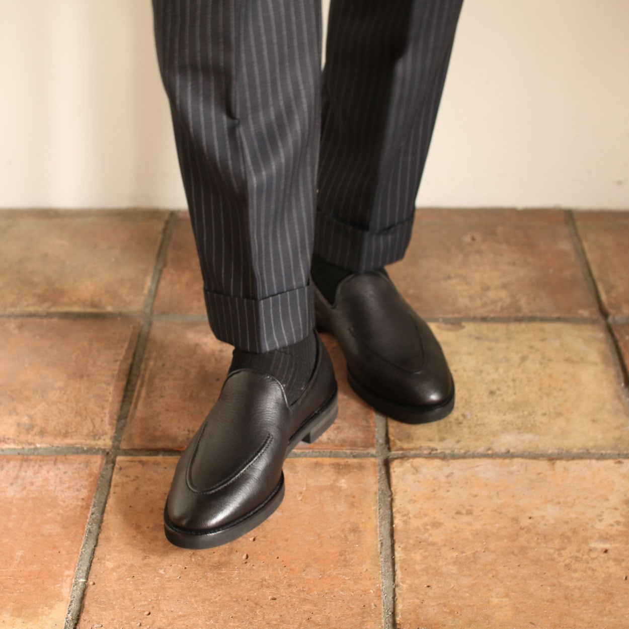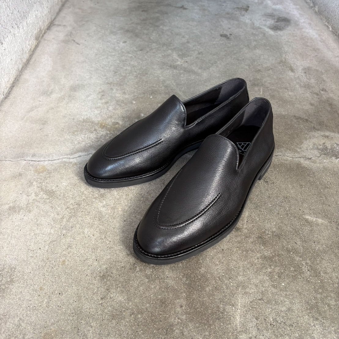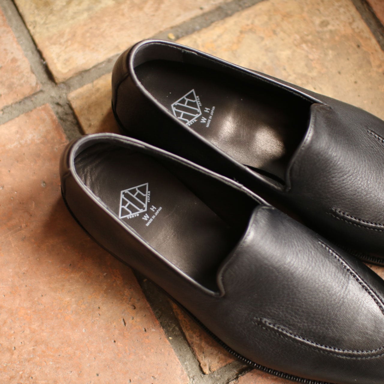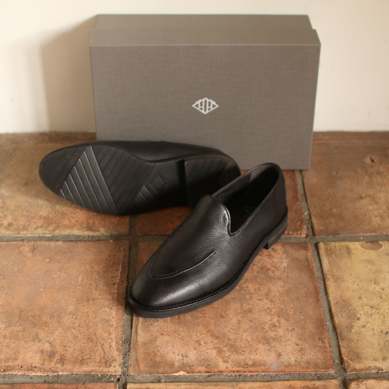 表面は柔らかいDEERSKINで内側はシックにブラックのライニング、アウトソールはダブルエイチオリジナルのフレックスソールを組み合わせました。