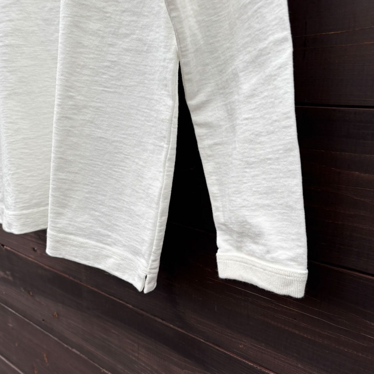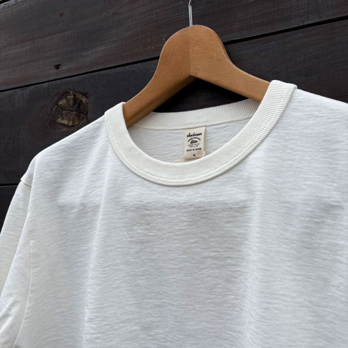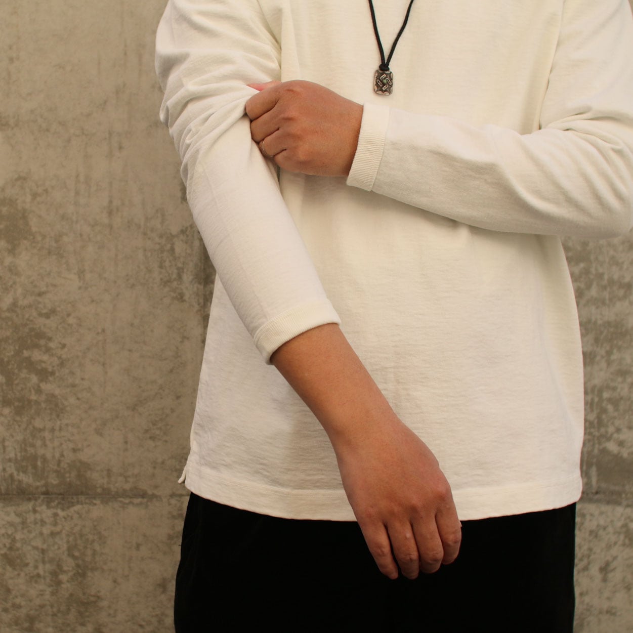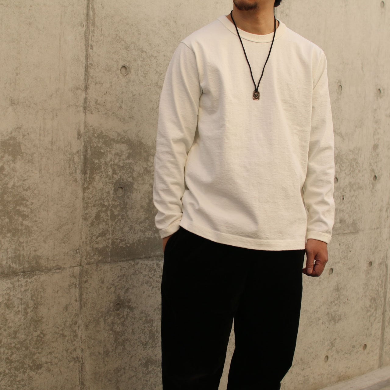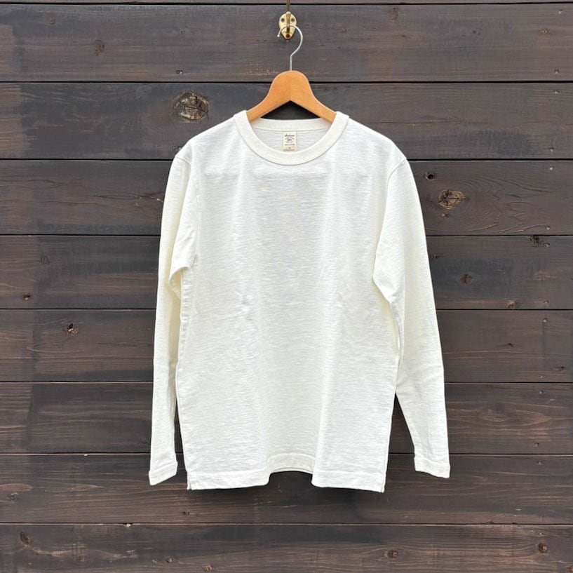 自動制御が効ないアナログな機械「吊り編み機」。シンカー編み機に比べて手間がかかり編み機の台数も限られていますが永く着用できる素材を開発する上で「均一に度目を詰める」必要があったため現在でも変わらず吊り編み機を使用して編み立てています。アメリカ産の綿を使用して編み立てたドツメ天竺は約11.5オンス。均等に度目が詰まっているため着用と洗濯を繰り返しても歪みや型崩れが起きにくい特徴があり、生地に硬さとハリ感があるため着用時も肌離れが良く快適です。そしてこの極厚生地を縫製する自社工場の技術で様々なドツメ天竺のアイテムをリリースしています。この長袖Tシャツは半袖Tシャツより1サイズ大きめの設計で首周りと袖口には身生地に合わせスウエット並みのしっかりとした厚みのリブを採用、全体のバランスを整えました。