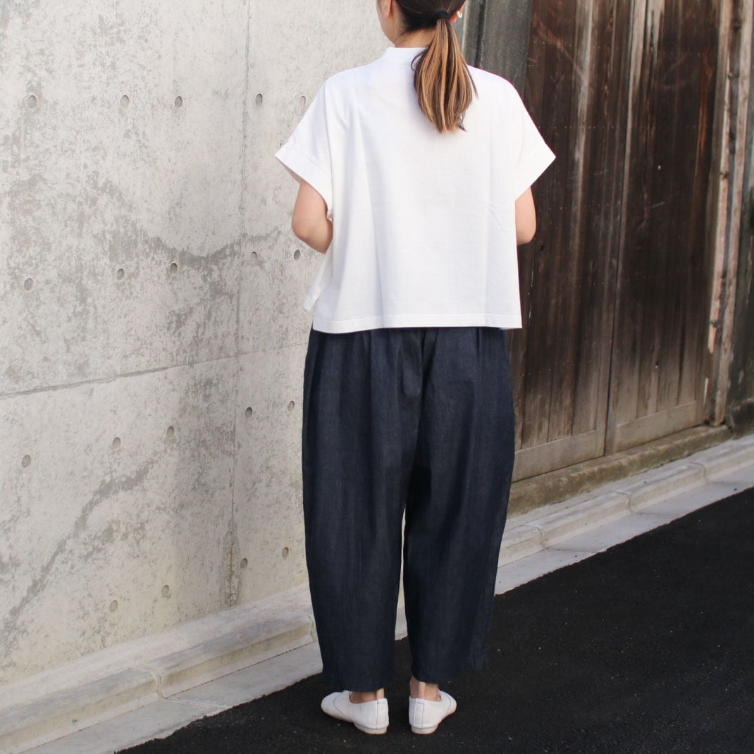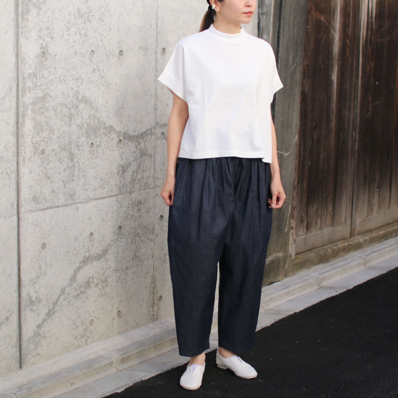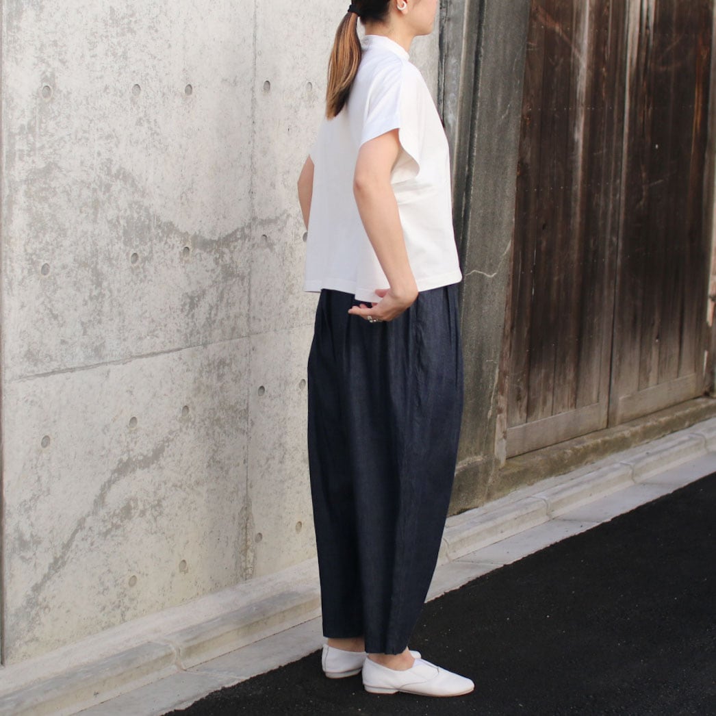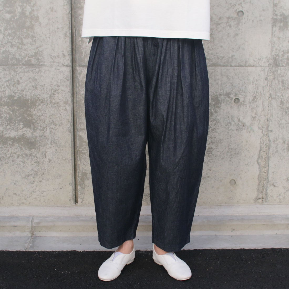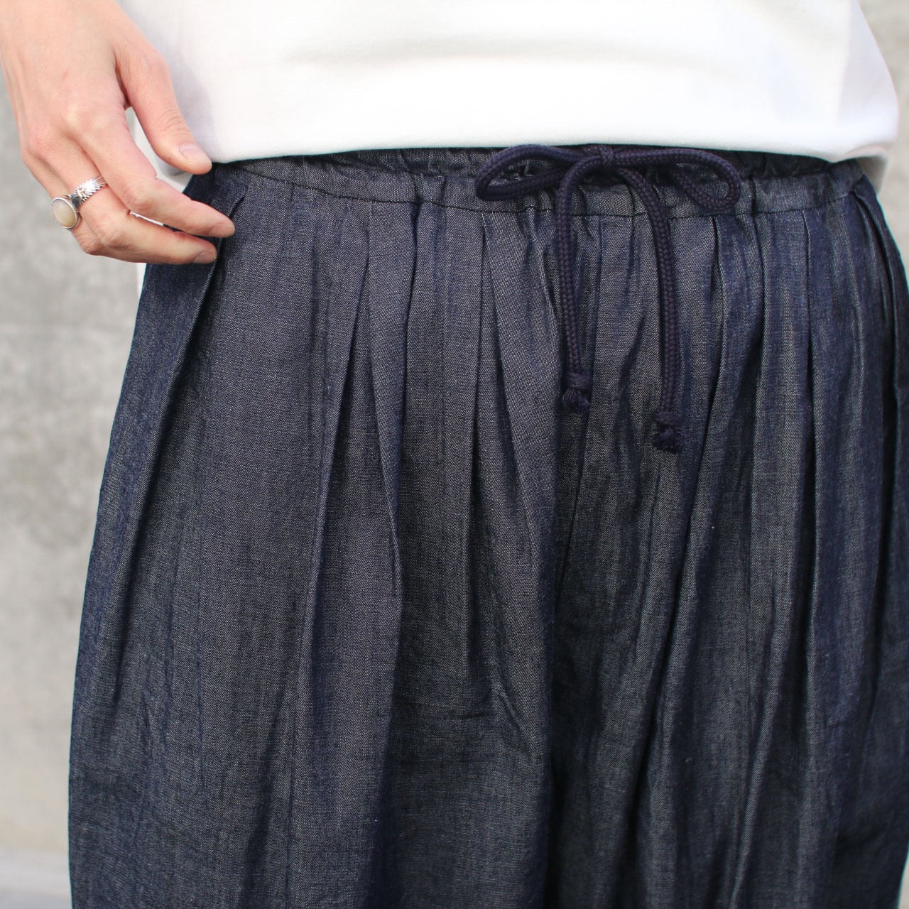 コットン100%の6ozデニムを使用したウエストにボックスタックとギャザーの入ったコクーンシルエットのギャザーパンツです。ヒップあたりが膨らみ、裾は少し細くなるコクーンシルエットはトップスも選ばず使えてコーディネートしやすいデザインです。