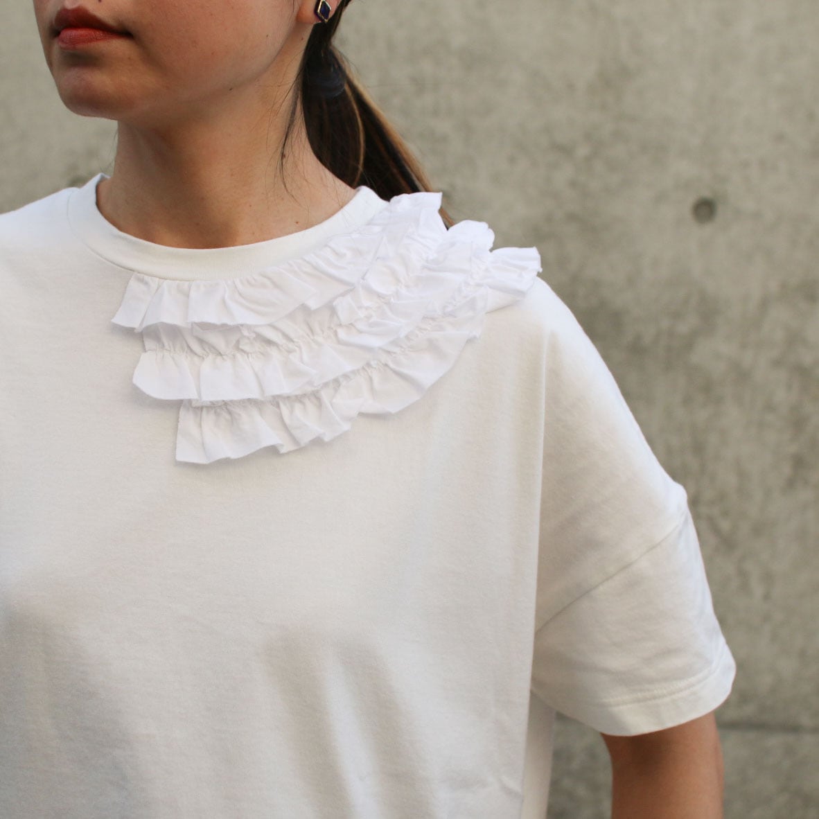 衿元の前中心から左にぐるりと後ろ中心までに3段フリルの装飾。シンプルにならず、ほどよく華やかさを持ったTシャツです。
