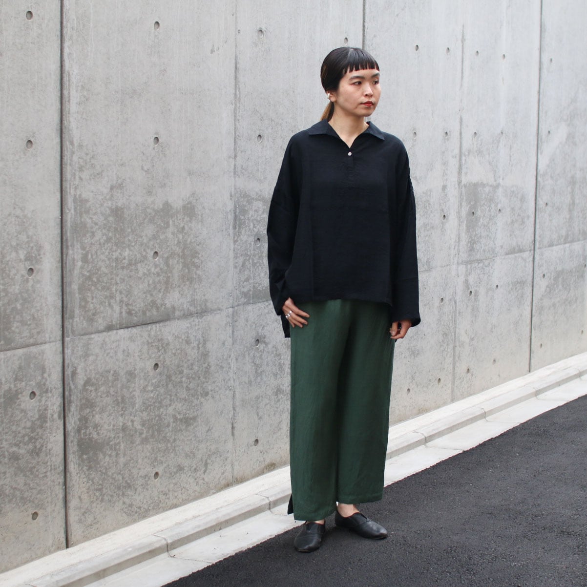 形は身幅がゆったりしたスキッパーシャツ。