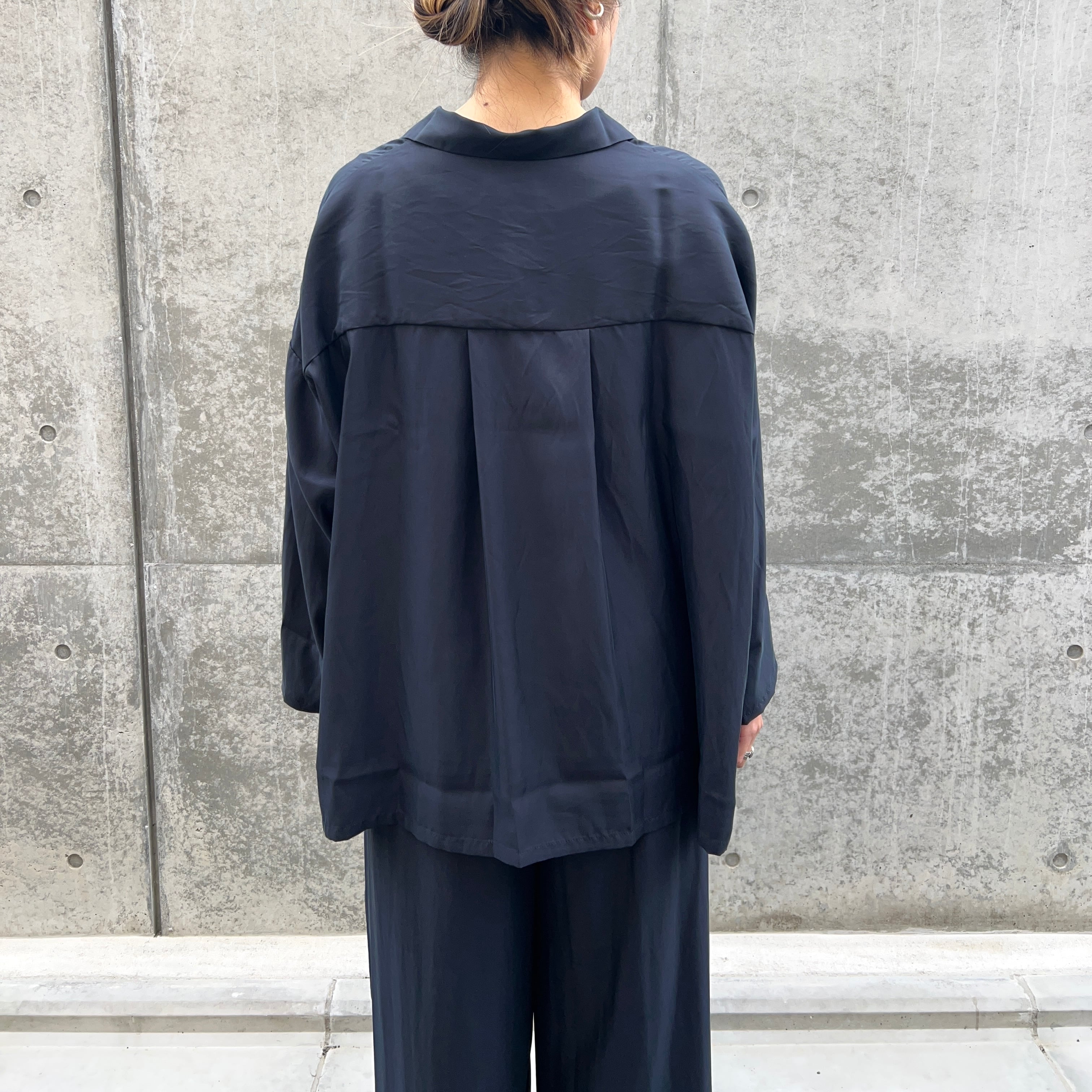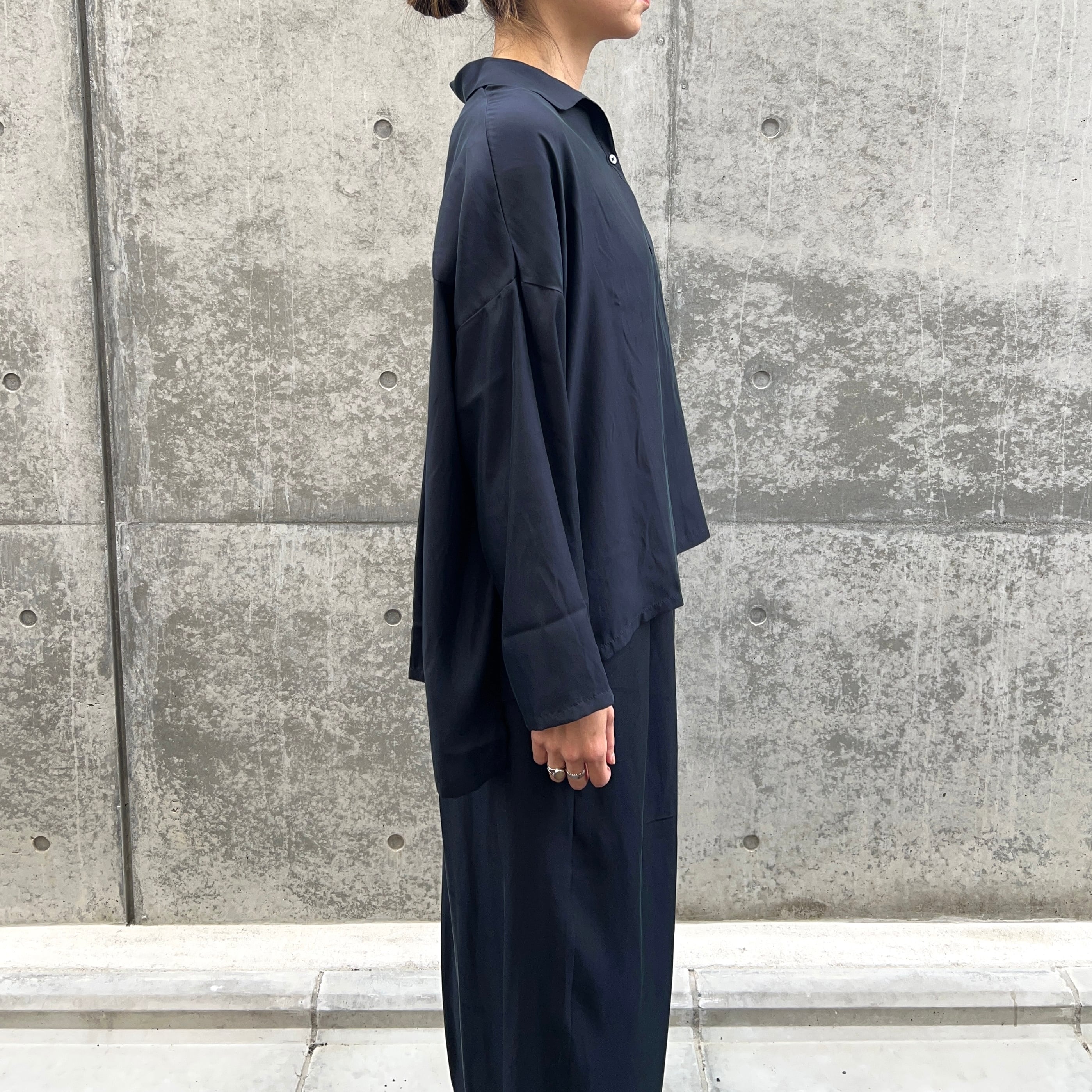 形は身幅がゆったりしたスキッパーシャツ。落ち感のある素材がしなやかに馴染んでリラックスしつつも上品な印象に。