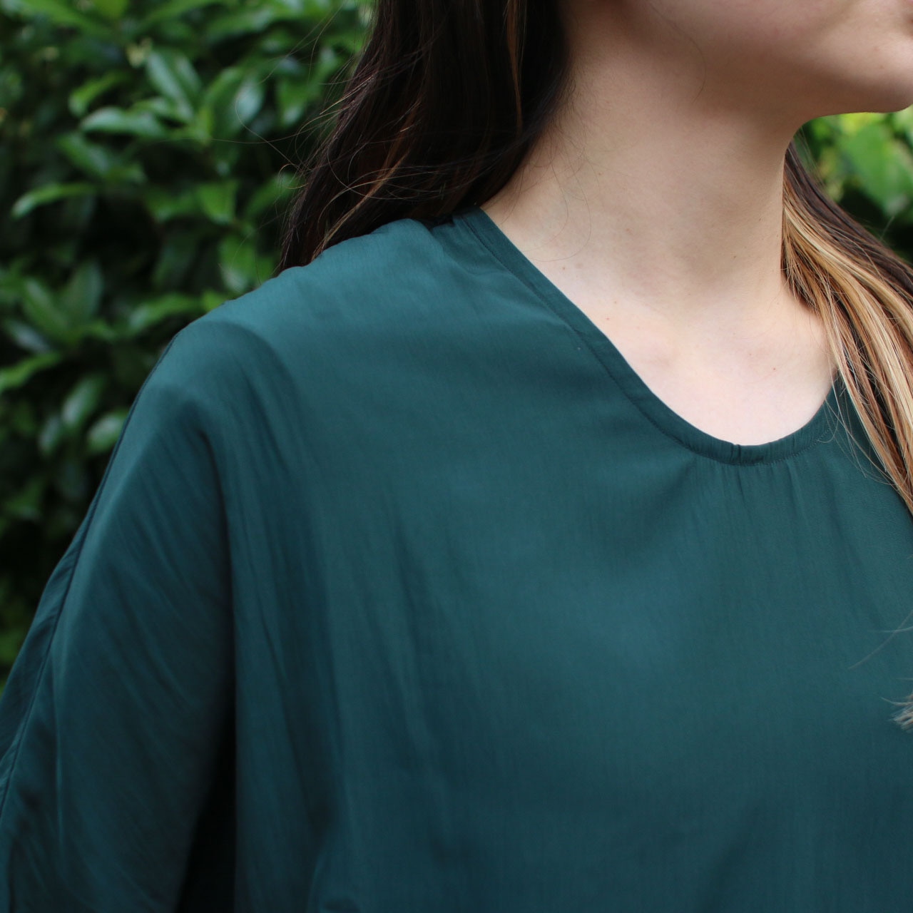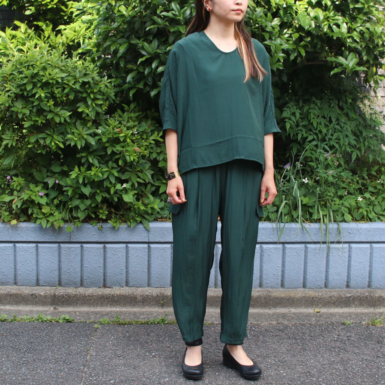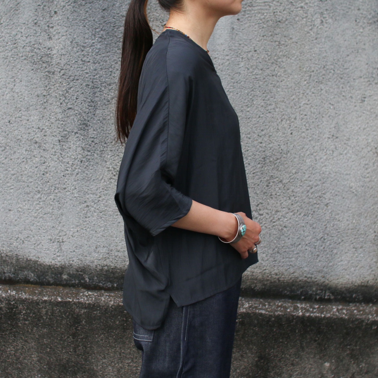 形は定番となります。ドルマンスリーブのたっぷりとしたTシャツのようなデザインですが、布帛素材なので、デイリーに使いながらちょっと雰囲気を変えられる 当店でも人気の1着です。