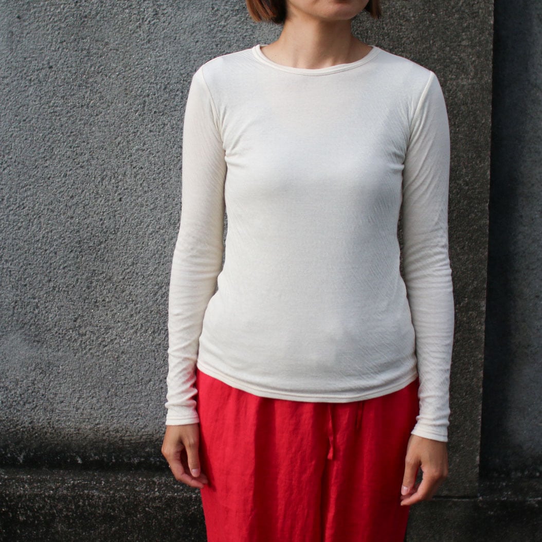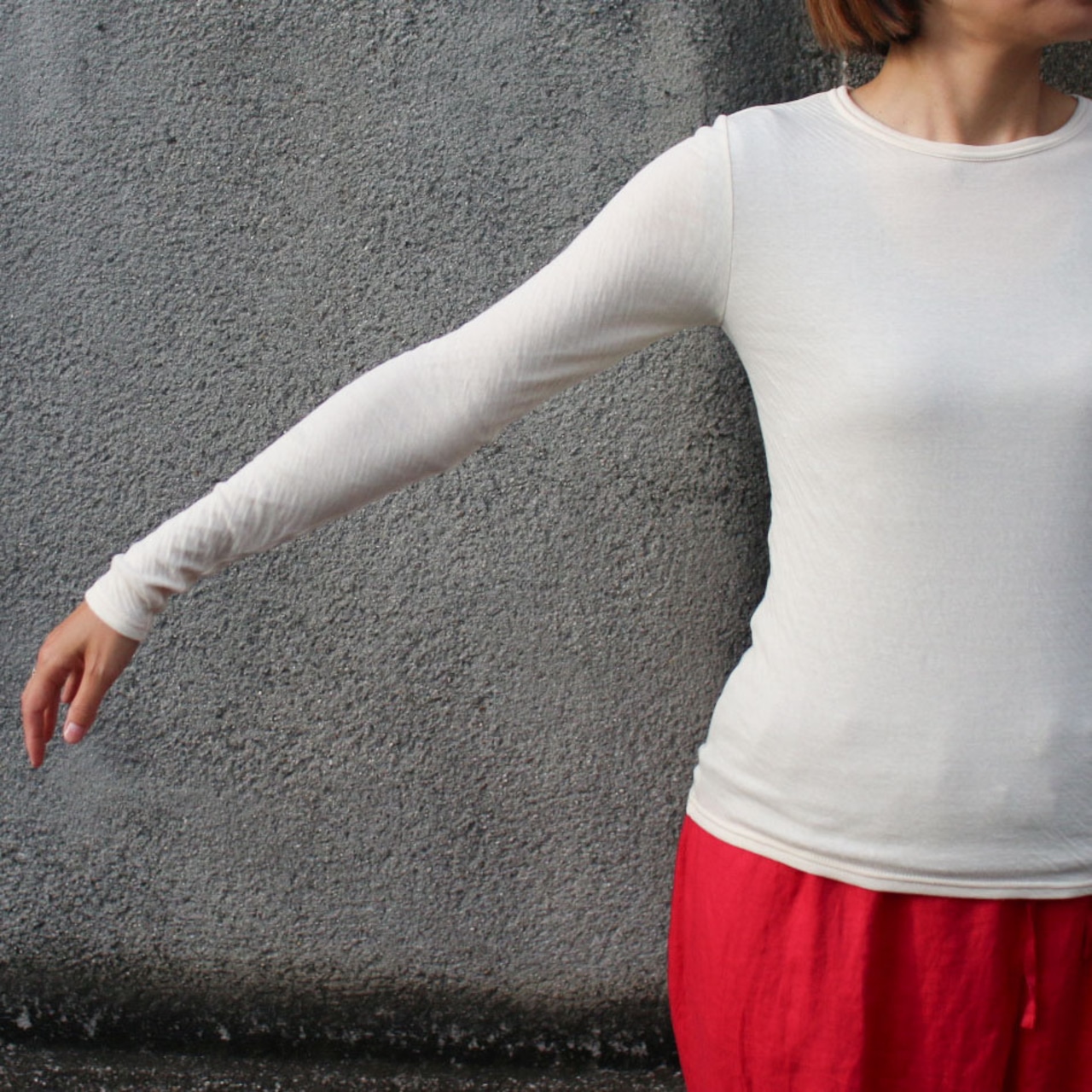 お袖・着丈は長めですので、手首でたるませたり伸ばして着たり裾もクシュっとさせたり、重ね着にぴったりです。同じフィット感でタートルネックも展開しています。