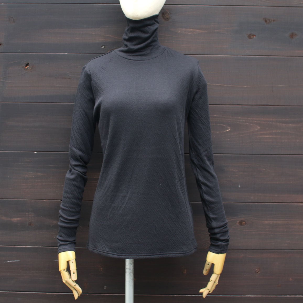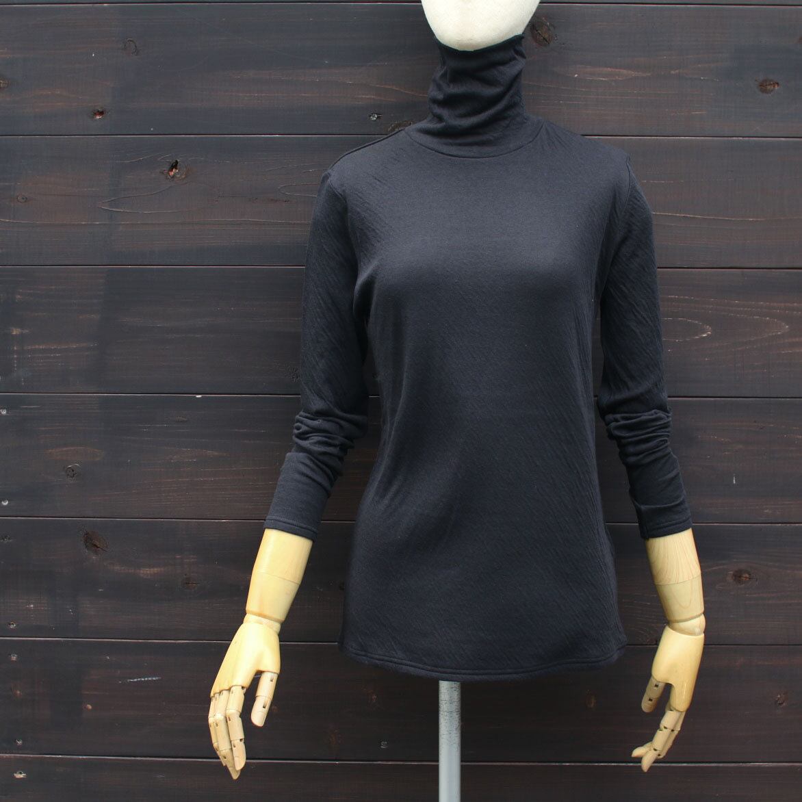 タートルネックは長めでクシュっとしやすいフィット感です。お袖も着丈も長めですので、手首でたるませたり伸ばして着たり裾もクシュっとさせたり、重ね着にぴったり。同じフィット感でクルーネックも展開しています。