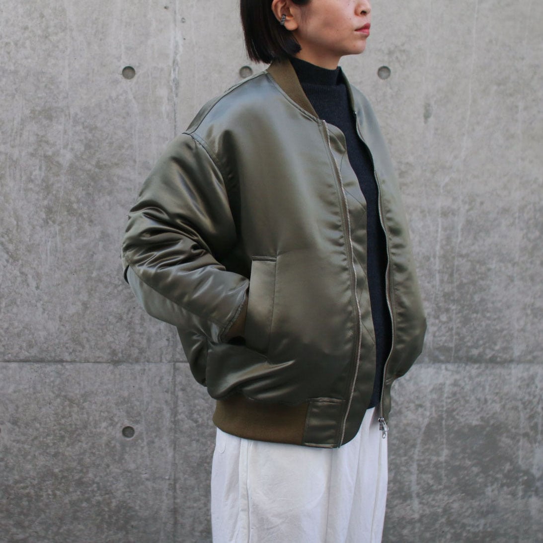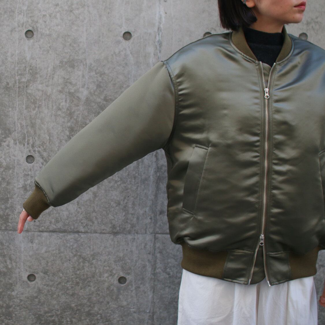 空軍パイロットに愛用されてきたフライトジャケット“MA-1”の着丈と少し長めに、オーバーサイズ気味にした抜け感のあるレディース向けにアレンジされたアウターです。