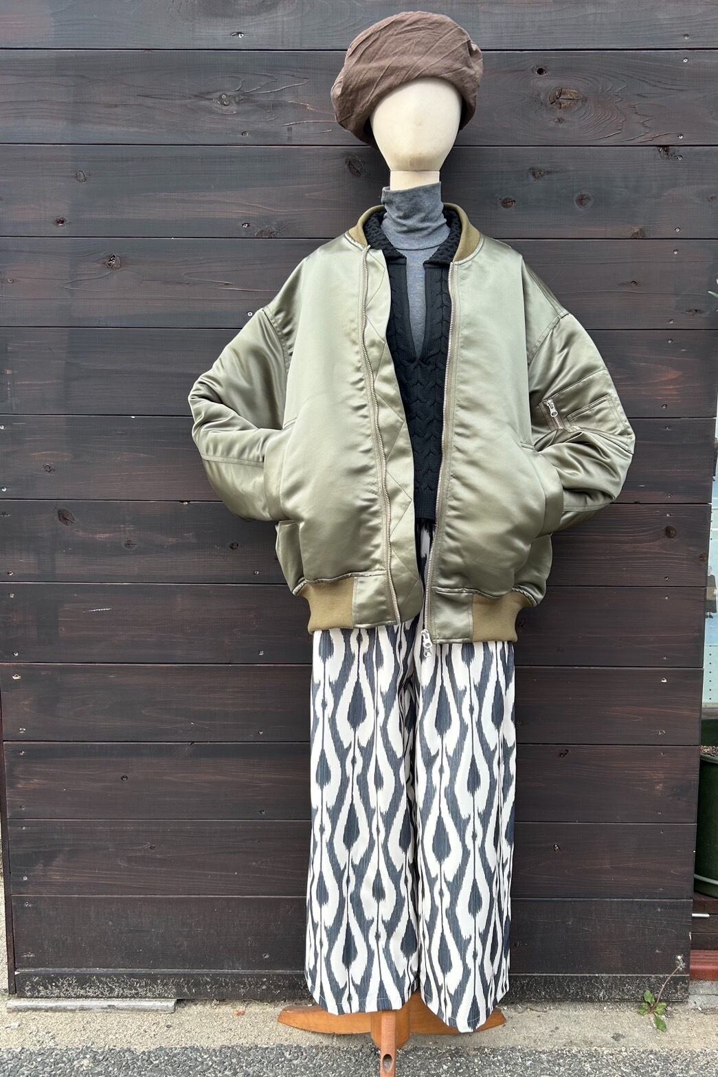 実際着ていただくと生地自体のハリももちろんありますが、ゆったりめの作りですので柄物やスカートや、トップスが大きめですのでボトムスはタイトにしたり、お袖を捲ったりしてメリハリをつけると、